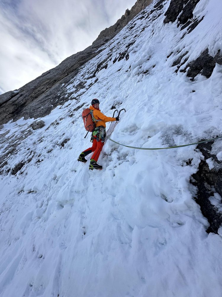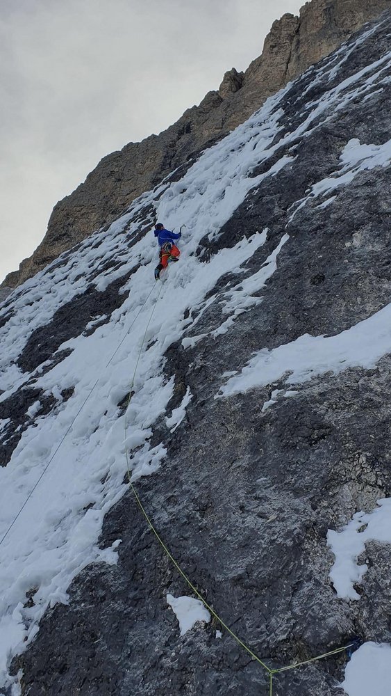 Nach einem Start über 2 Seillängen (80 m) der Sommerroute„Prinzessin im Herzen“ (I. Rabanser) mit einigen Schlaghaken und einem Kronenbohrhaken am Standplatz eigenständig mit 1 belassenen Standhaken 7 Seillängen (350 m) über den Eispanzer bis zum Beginn der „Legrima“.