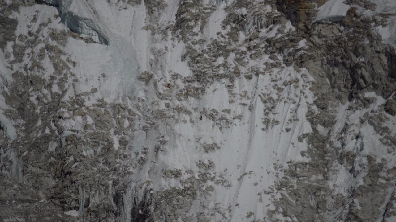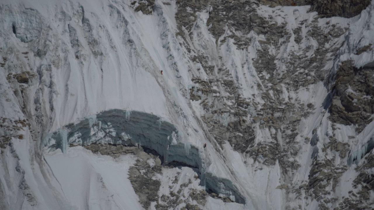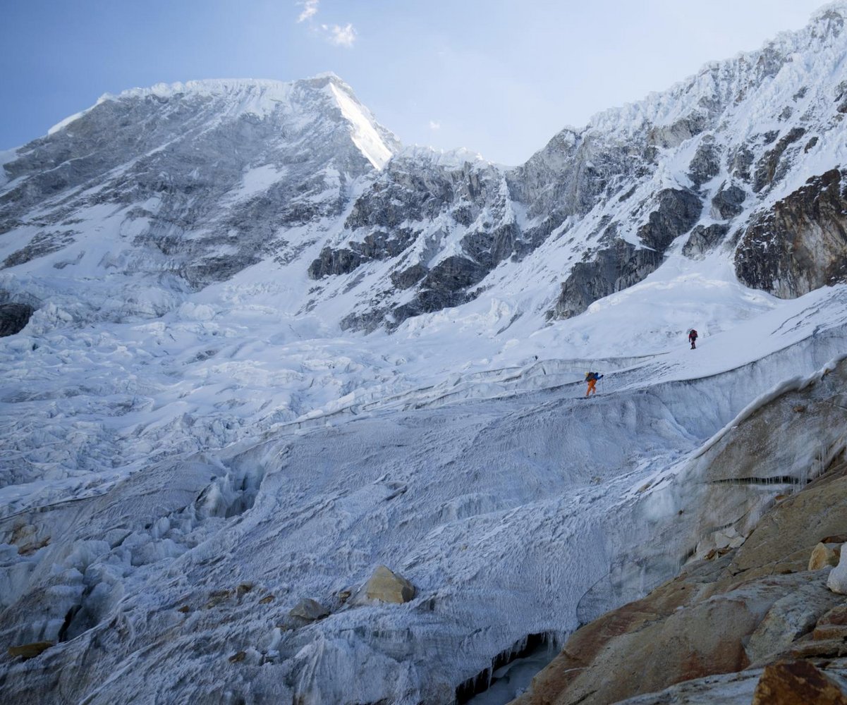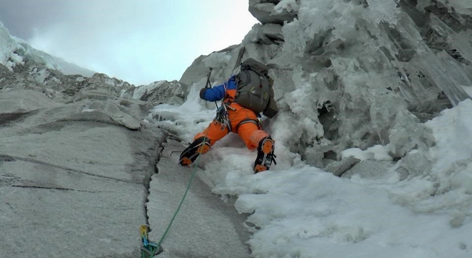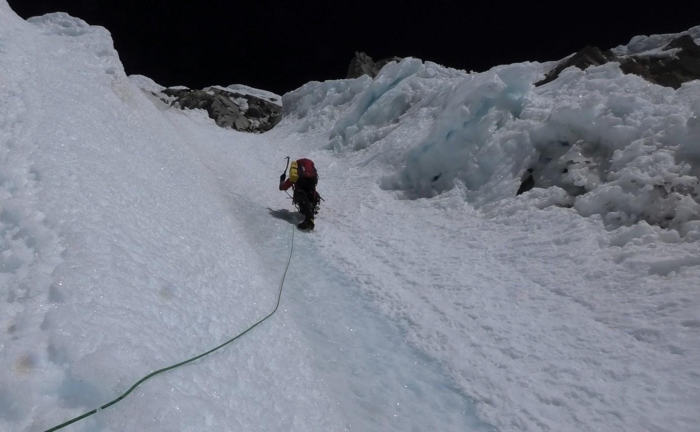 Mit der Dämmerung geht es mit dem Klettern los. Ich fühle mich noch ein wenig steif, aber dank des steilen Aufstiegs wird mir schnell warm. Die Wand wird immer vertikaler und die Schneefelder werden immer steiler. Aus dem Firnschnee wird Eis, gemischt mit großen Felsstufen. Nach zwei Stunden Simul-Klettern halten wir an einer 150 m hohen Felsbarriere. Ich sichere Radek und wir machen uns startklar für unsere erste große Herausforderung. Diese Felswand ist die obligatorische Eintrittskarte für die nächsten tausend Meter. Es gibt keinen Ausweg. Entweder schaffen wir es und können weiterklettern oder wir müssen wieder zurück ins Tal. Dabei ist noch nicht mal das Klettern selbst das zentrale Problem. Der gesamte Ort sieht aus wie ein riesiger Felsenregen. Ich probiere so schnell zu klettern wie möglich, um nicht von einem Felsen getroffen zu werden. Die nächste Herausforderung besteht in einer langen Durchquerung des zweiten Eisfelds, das oben links zudem Mixedklettern erfordert. Der Mixed-Teil sieht aus wie der Buchstabe «S» und beginnt mit einem kniffeligen Felsabschnitt, gefolgt von einer schmalen Verschneidung. Von unserem Standpunkt aus können wir sehen, dass die Verschneidung für unseren Versuch mehr als gut ausgestattet ist, mit großen losen Eisspalten, die aussehen wie majestätische Orgelpfeifen.