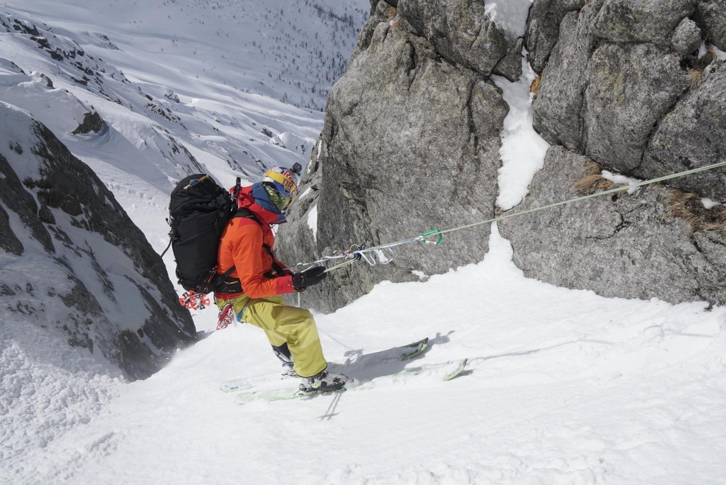Stefan Grüner und Aaron Durogati waren mit von der Partie. Nachdem wir uns zum Gipfel hinaufwühlten, war es etwas kompliziert, die richtige Einfahrt zu erwischen, da ein Felsturm im Weg stand. Trotzdem konnten wir direkt vom Gipfelkreuz aus einfahren. Der obere Teil war extrem steil (55°). Nach etwa 150m wartete eine kurze Steilstufe (ca. 2m) und nach weiteren 100m mussten wir über eine überhängende Passage 15 Meter abseilen. Darunter ging es noch weitere 400 Meter bei guten Verhältnissen und einigen kurzen sehr steilen Passagen bis zum Wandfuß hinunter. Danach wartete noch ca. 500 Meter Gegenanstieg zur Kuhleitenhütte.