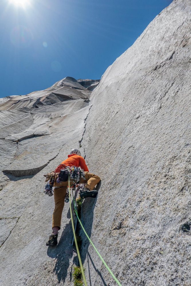 Wenn möglich am besten Totem Cams verwenden, diese klemmen immer und auch viel besser als die anderen Marken. Die spannendsten Seillängen sind sicher das Great Roof, Glowering Spot und Changing Corners (vor allem kleine Friends). Viele Schraubkarabiner braucht es und gutes Standplatzhandling.
