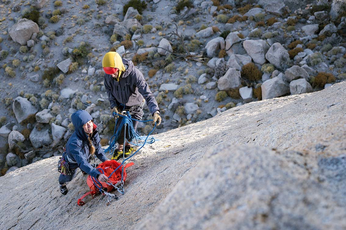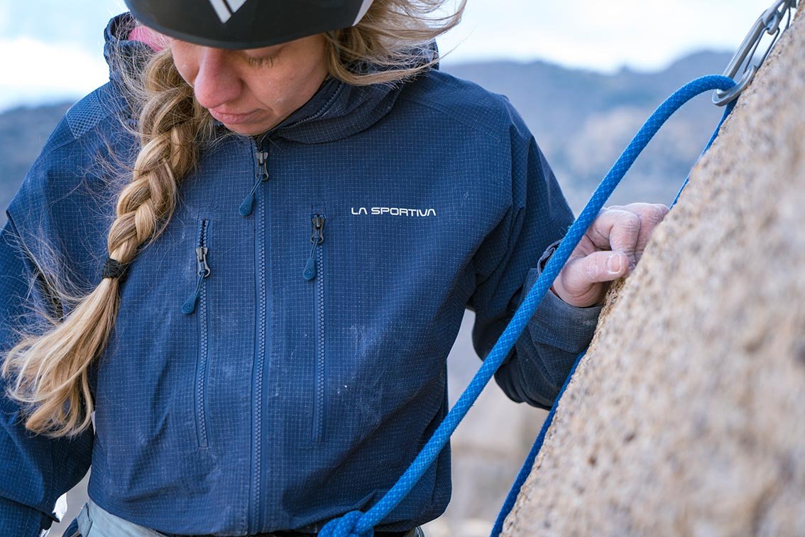 „Was Helixir so besonders macht, ist ihr außergewöhnlich elastisches Gewebe. Wenn du dich nach dem nächsten Griff streckst, bewegt sich die Shell mit dir und sorgt dafür, dass dich nichts auf dem Weg zum Gipfel zurückhält. Wir wissen, wie essenziell wichtig flüssige Bewegungen beim alpinen Klettern sind. Aus diesem Grund ist jede Naht, jedes Paneel strategisch platziert und dient einzig dem Zweck der uneingeschränkten Bewegungsfreiheit.