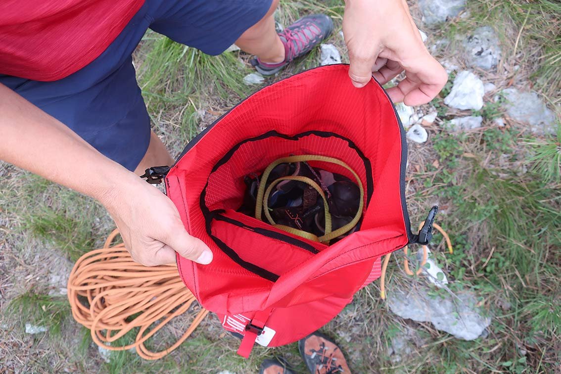 Der Rucksack ist mit 32 Litern eigentlich im alpinen Mittelbereich angesiedelt, durch den Rollverschluss, welcher zusätzlich noch mit einer dreieckigen Deckeltasche überdeckt wird, ist man aber noch etwas flexibler beim Volumen - es geht mehr als die genannten 32 Liter hinein. Ein großes, dreieckiges Fach in der Deckeltasche und die Möglichkeit im Bereich der Rückenauflage etwas zu verstauen, mehr kleine Fächer gibt es nicht.