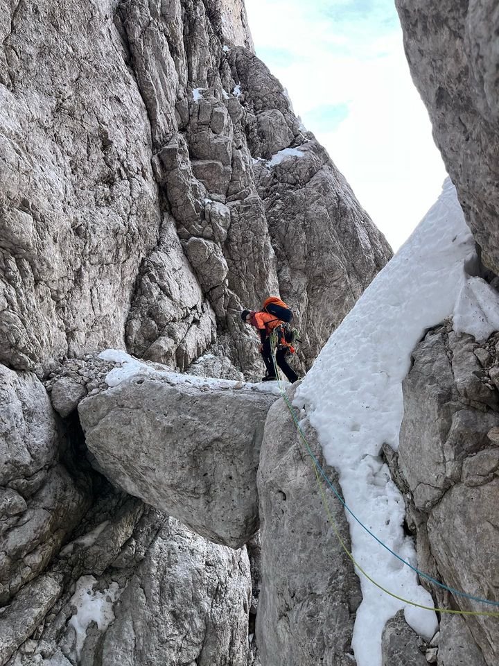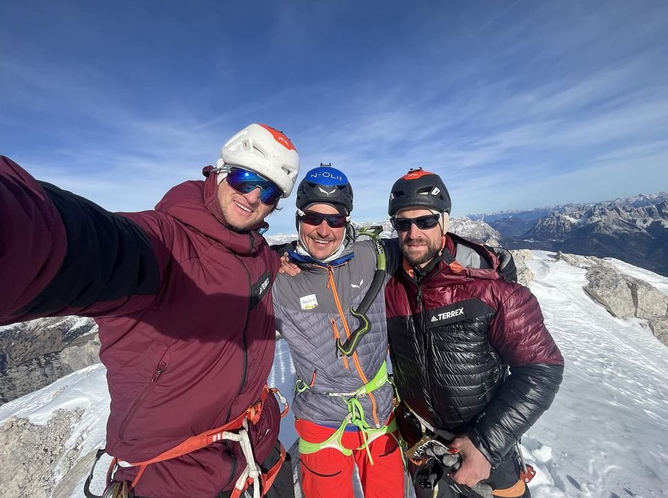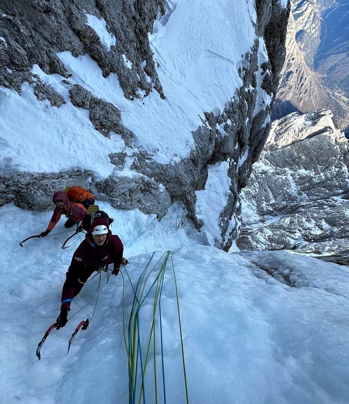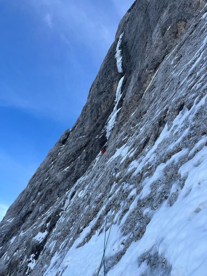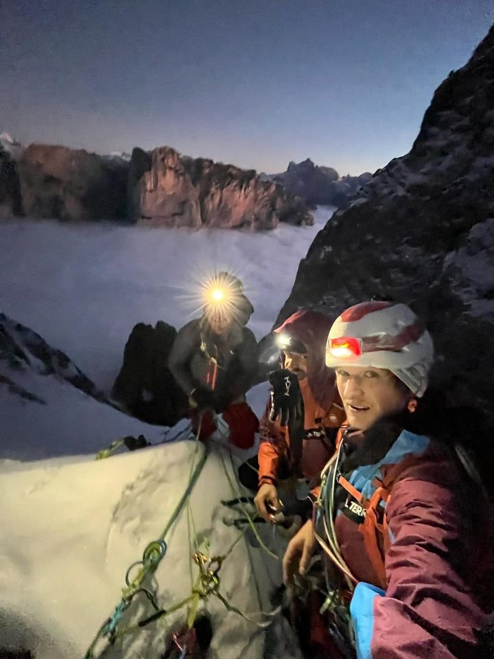 Simon Gietl, Lukas Hinterberger und Michi Wohlleben gelingt die erste Ground-Up-Begehung der Mixedlinie Ultima Perla. Vom 27. bis 29. Dezember durchstiegen sie die komplexe und imposante Nordwand des Monte Agnèr. Um zum Eisfall im oberen Wandabschnitt zu gelangen, kletterte das Trio die Messner/Holzer – eine Route, die im Winter erst einmal begangen wurde.