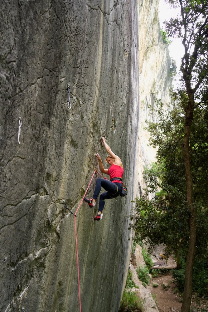 Ich habe im Laufe der Jahre festgestellt, dass mir das Klettern im Überhang zwar sehr viel Spaß macht, meine wahre Stärke aber Fingerkraft und technische Routen sind und so dachte ich sofort, dass ich diese Route versuchen möchte. Als ich letztes Jahr mit Klaas Willems auf Sardinien kletterte, erzählte er mir, dass er auch an der Route interessiert sei, und so vereinbarten wir, es gemeinsam zu versuchen. Als Klaas Mitte März in Arco ankam, war ich gerade von einer Reise zum Eisklettern nach Kanada zurückgekehrt und hatte drei Monate lang nicht trainieren können, weil ich mir im November die Schulter verletzt hatte. Ich habe den Winter nach meinem Geschmack zwischen Eis, Fels und Drytooling verbracht, konnte aber nur locker klettern, um meine Schulter zu schonen. Es war nicht der ideale Ausgangspunkt und wie vermutet tat ich mir anfangs schwer in der Route. Ich schaffte es kaum, die winzigen Griffe zu halten und versuchte, wenigstens die einzelnen Bewegungen zu verstehen. Der erste Teil der Route ist sehr boulderig. Der Schlüsselzug ist eine sehr weite Bewegung nach rechts, sogar leicht abwärts zu einer Kerbe, von der aus man dann zum nächsten Griff kreuzen muss.
