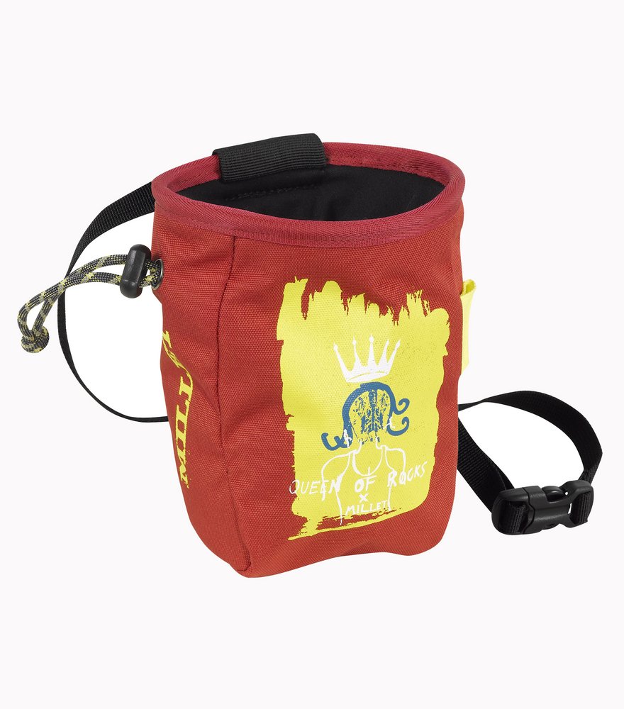 DieIt-Bags für Urban Climbers: Der Fleece gefütterte Ergo Chalk Bag mit exklusivem Millet „Queen of Rocks“ Design lässt sich per Kordelzug staubdicht verschließen und kann wahlweise per Karabiner oder Gürtel mit Schnallenverschluss befestigt werden. Er verfügt über eine Boulderbürstenhalterung und kostet 19,90 Euro.