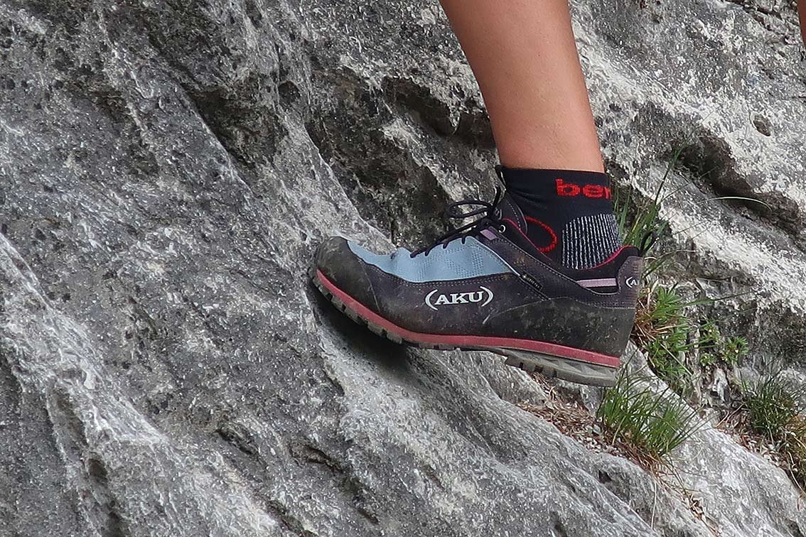 Der Aku Link GTX wird eigentlich als Trekking Schuh angepriesen, der Schuh macht aber gerade beim Zustieg und Klettern eine sehr gute Figur. Leichte Klettereien bis zum 4ten Schwierigkeitsgrad machen mit dem Link Spaß und auch auf schwierigen Klettersteigen macht der Schuh eine perfekte Figur und klebt auf Reibungstritten quasi an der Wand. Durch die stabile Lederkonstruktion hat man ein gutes, festes, aber doch etwas flexibles Gefühl im Vorderfuß - bei längerem Zu- und Abstieg läuft auch alles wie am Schnürchen.