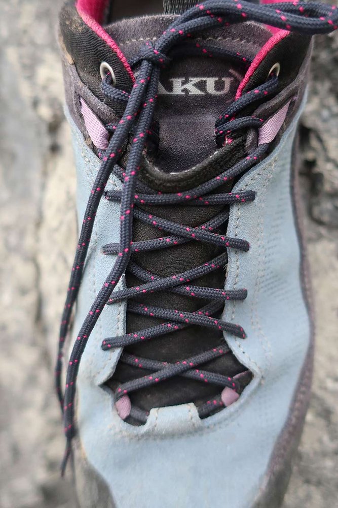 Im Gegensatz zum Rock GTX ist der Link GTX etwas einfacher konstruiert, man hat beim Link deutlich weniger Schuhband-Material, was die fast etwas bessere Passform vom Link nicht beeinflusst. Der Link GTX hat statt der zusätzlichen Gummischnürung eine Art Gummimanschette, in die man beim Anziehen wie in einen Socken hinein schlüpft. Man sitzt in der Ferse wirklich gut drin und kann den Halt mit den geschickt angeordneten Schuhbändern noch zusätzlich stabilisieren.