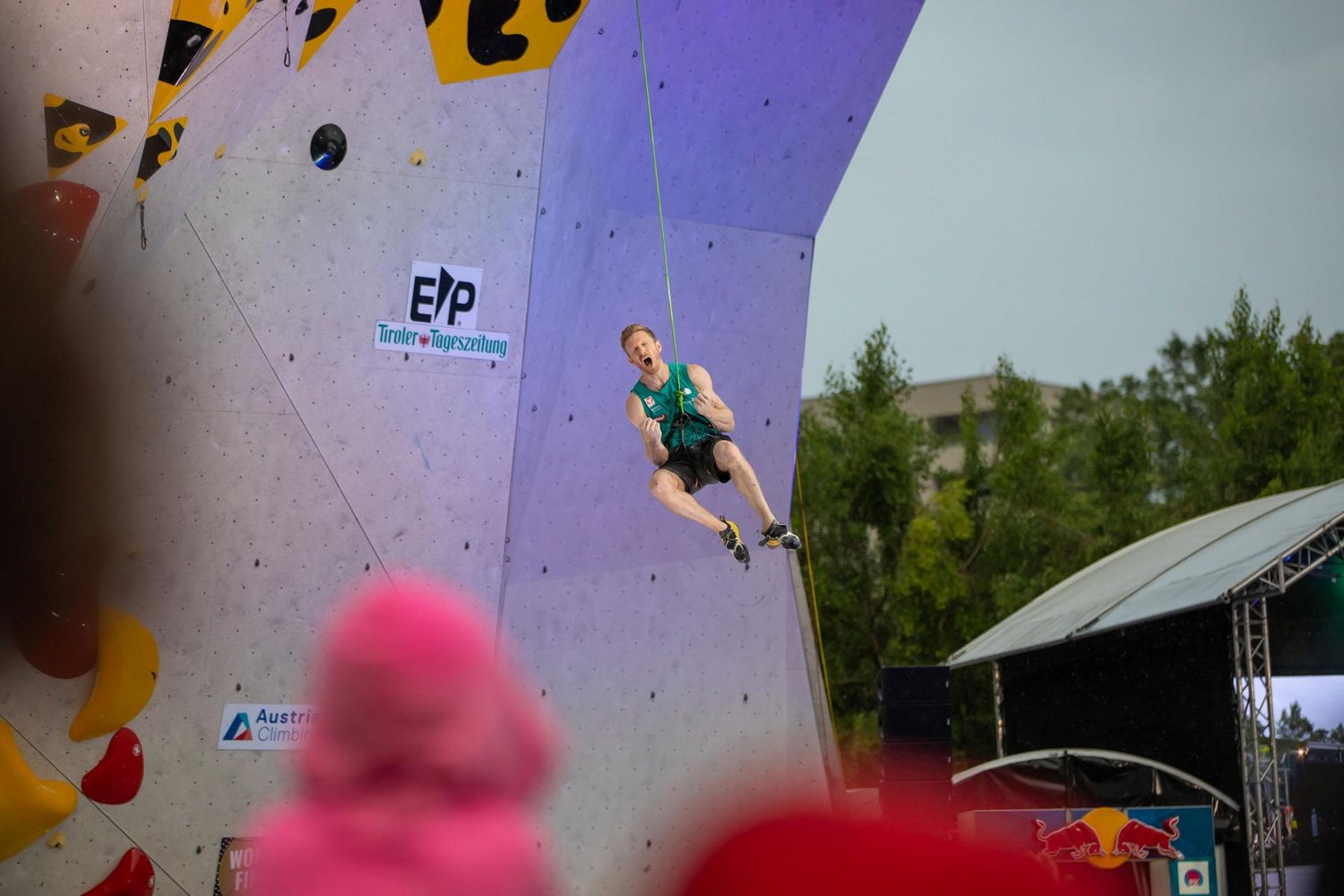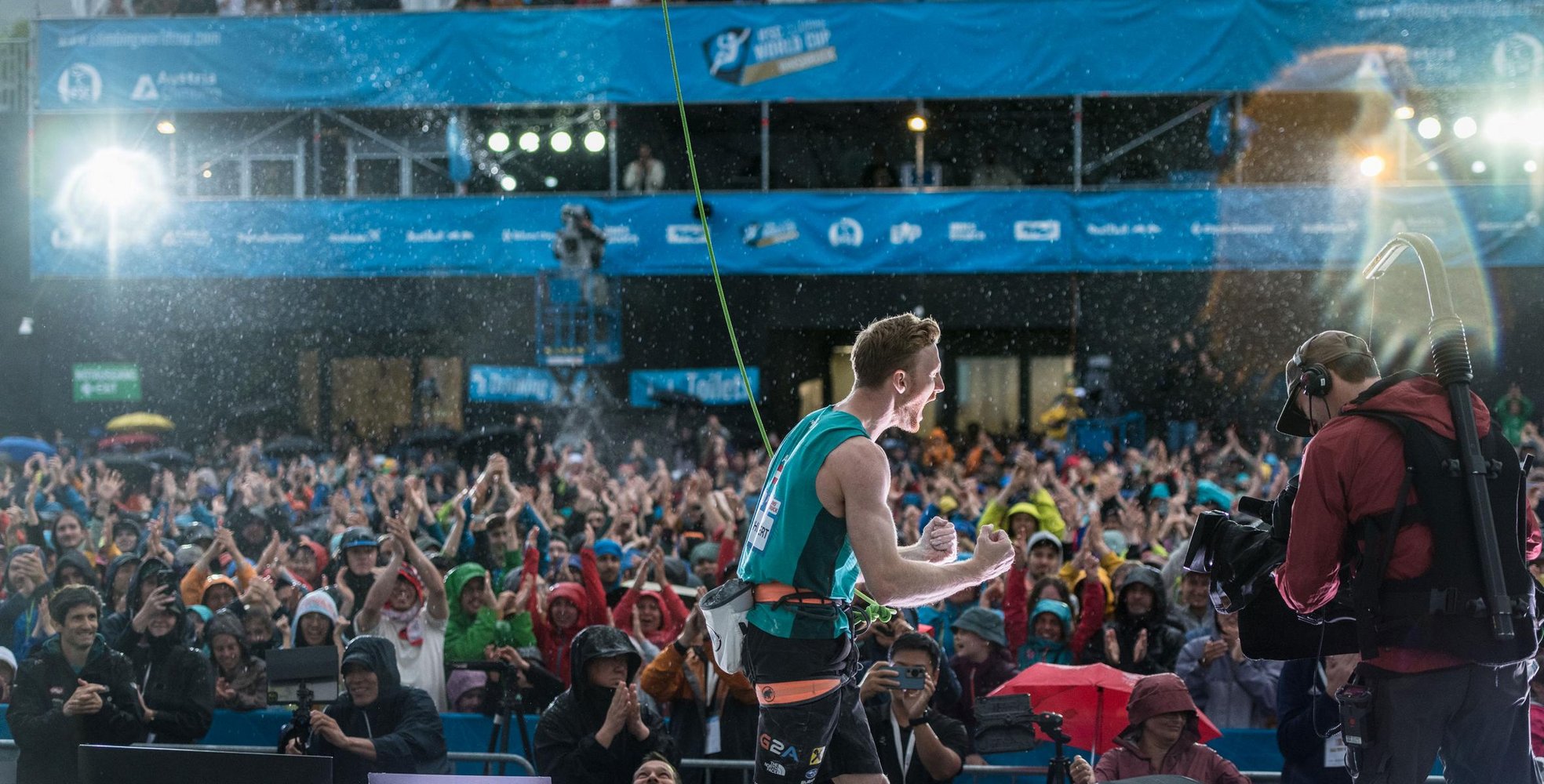 3.000 Fans waren trotz Regens gekommen, um Jakob Schubert siegen zu sehen. Der sechsfache Kletter-Weltmeister hat dem Druck wieder einmal standgehalten. Als Halbfinalsieger kam er als letzter Athlet an die Wand, die kniffelige Finalroute verlangte ihm alles ab. „Die Route war definitiv schwieriger als wir gedacht haben. Manche Griffe waren eher schlecht, dann waren wieder neue dabei, auch die Reibung war heute nicht so prickelnd. Es war einfach unangenehm und schwierig. Ich dachte bei einigen Zügen, das war es jetzt, aber ich bin irgendwie drinnen geblieben“, so Schubert. „Mein Klettern war nicht optimal, aber der Fight war genial.“
