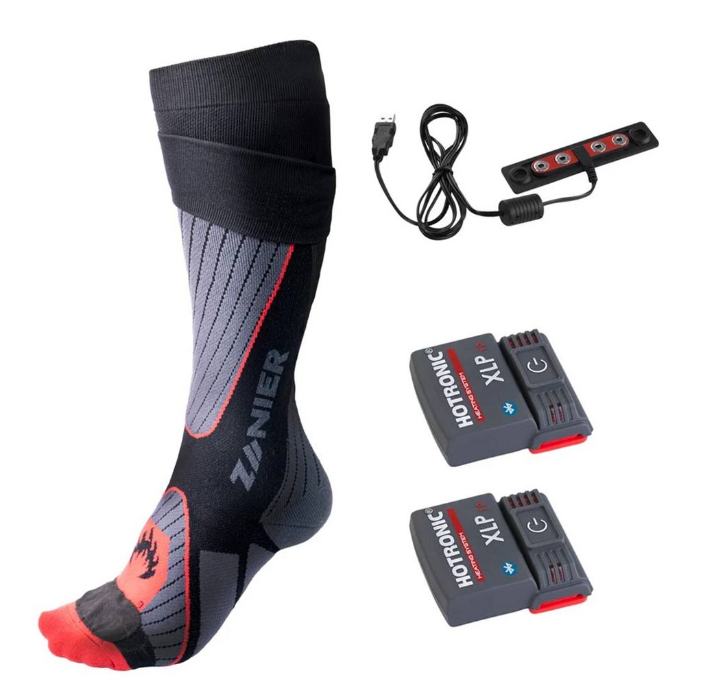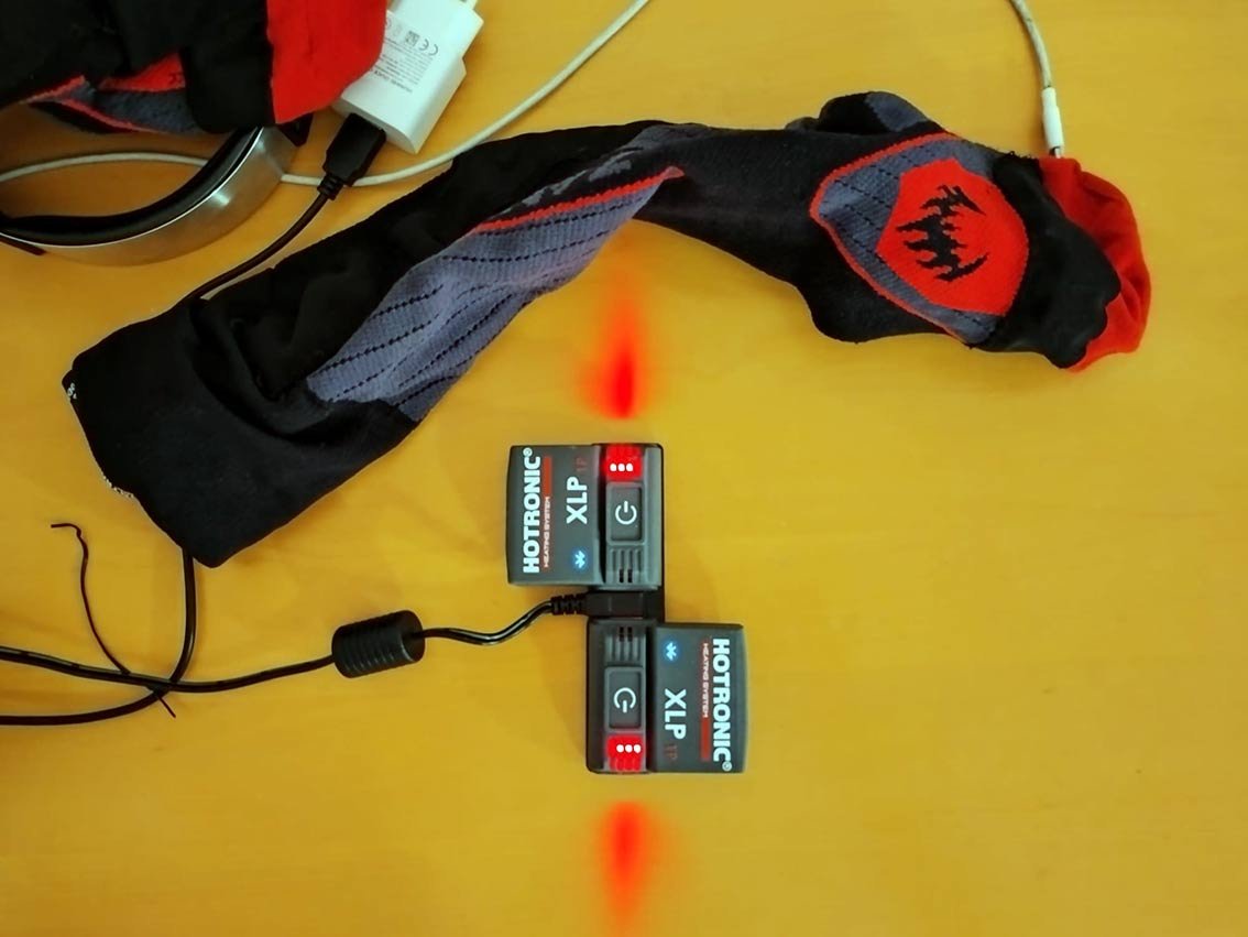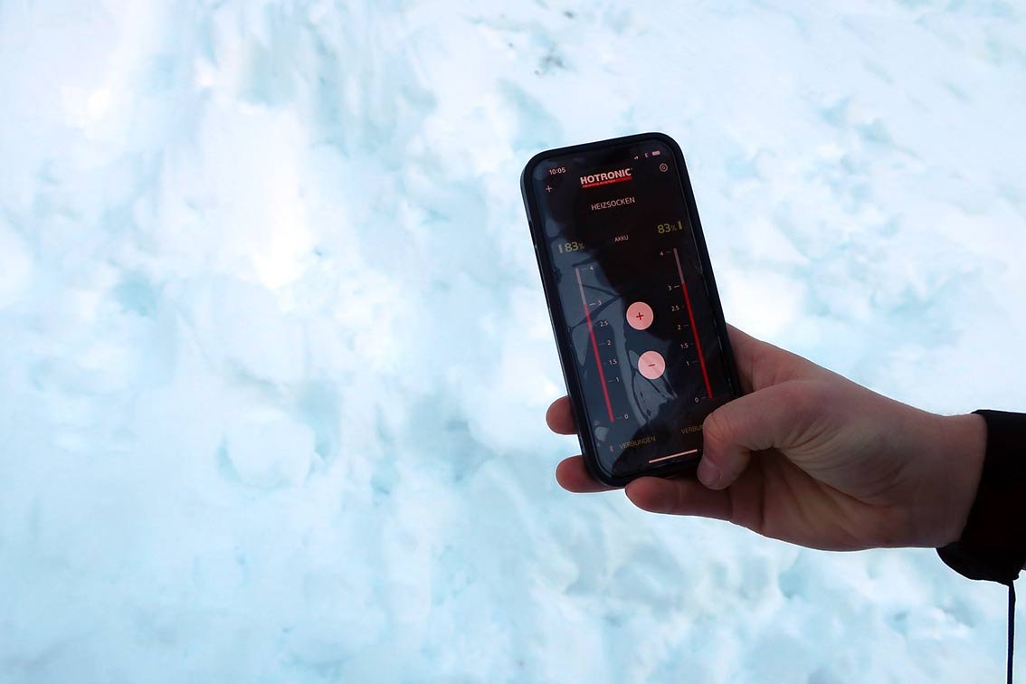 Man bekommt im Karton ein Paar Heizsocken (aus einem Mix aus Merinowolle und strapazierfähigen Funktionsfasern), zwei Mal Akkus und ein USB-Ladegerät. Durch die Bluetooth-Verbindung muss man sich weder die Hose raufziehen, noch sonst irgendwelche Veränderungen an der Kleidung vornehmen, einfach die HandyApp starten und die Heizsocken von dort aus bei Bedarf bedienen. Es gibt natürlich auch beheizbare Handschuhe, da Handschuhe beim Eisklettern schnell verschleißen machen diese nur am Standplatz Sinn.