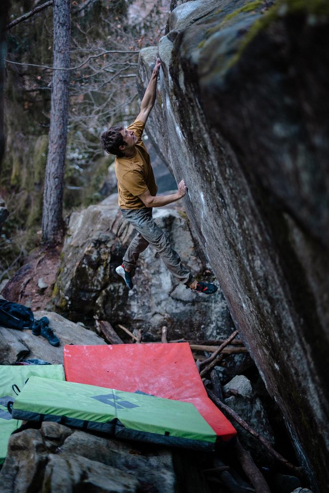Dieses Jahr bin ich mit dem Ziel zurückgekehrt, den Boulder zu knacken. Schon am zweiten Tag in Bavona trug ich alle meine Crashpads dorthin und startete einen neuen Anlauf. Ich fand schnell heraus, dass die Züge, die ich letztes Jahr versucht hatte, nicht funktionierten. Also suchte ich nach einem anderen Weg. Anstatt von einem kleinen leistenartigen Loch zu einer flachen Leiste zu schnappen, fand ich einen Toehook für den rechten Fuß sowie eine Möglichkeit, mit dem linken Fuß hoch anzusteigen, sodass ich diesen Zug statisch halten konnte. Nach vielen Versuchen habe ich den Zug schließlich zum ersten Mal geschafft. Das Spiel geht weiter!