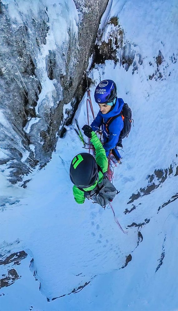 Die Zeit im Nacken starten wir sofort mit der Kletterei. Senkrechtes, röhriges Eis mit Schneeeinschlüssen lässt schon auf den ersten Metern erahnen, dass Zwischensicherungen eher nur den Kletterfluss unterbrechen. Nach 50m halte ich Ausschau nach einer Standplatzmöglichkeit. Unterhalb des freihängenden Zapfens ist ein feiner Querriss, der sich für Schlaghaken anbietet. Noch zwei, drei delikate Kletterzüge auf Glasuren und Styroporeis und ich erreiche die positiven Strukturen im Fels. Ein Messer- und ein Profilhaken singen sich den Weg in die Fuge. Perfekt. Nachkommen.