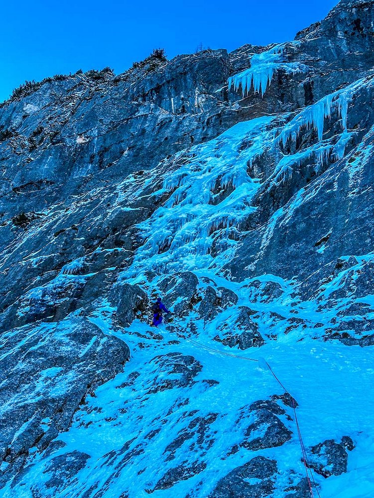 Am letzten Hängepunkt kann ich das herabhängende Eis schon fast erreichen. Ein paar Züge an Glasuren und dann kann man auf den ca. 4 m langen filigranen Zapfen aussteigen. Tobi lässt mich zum Stand hinab und ich ziehe das Seil ab. Wieder eingebunden, steige ich sofort los. Es ist gerade so viel Struktur vorhanden, dass ein freies Klettern möglich macht. Ich spüre eine leichte Anspannung, hier gleich aufs Erste abliefern zu müssen. Es ist doch steiler als gedacht. Am letzten Sicherungspunkt angekommen, heißt es nun beherzt einen Runout in Kauf zu nehmen, um das rettende Eis darüber zu erreichen.