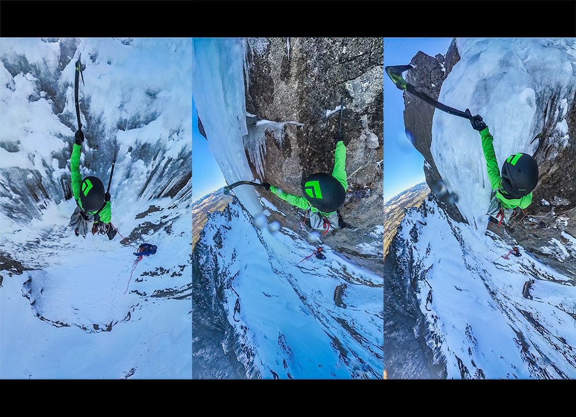 Die Absicherung erweist sich als sehr komplex. Ich entschließe mich den Fels zuerst technisch zu begehen und die Sicherungen am Eisgerät hängend zu montieren.