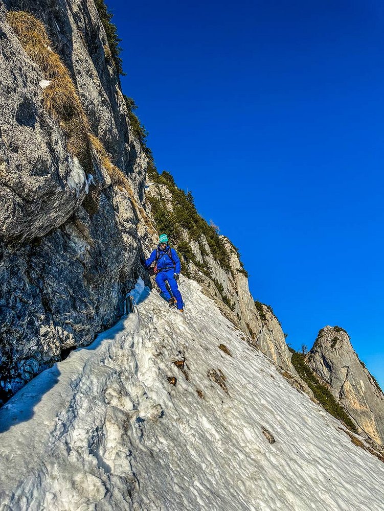 Man sieht sie von der Autobahn aus, wenn man vom Süden kommend nach Salzburg fährt, die Ostwand des Untersbergs mit ihrer Doppler- und Rosittenwand. Letztere hat ein großes steiles Schneefeld darüber und versorgt die darunterliegenden steilen Wandteile mit Wasser. Eine markante Rinne zeichnet die logische Linie wie der Pinselstrich eines Landschaftsmalers durch die Wand, die von Salzburg aus so gut sichtbar ist.