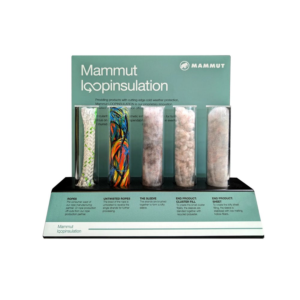 Innovationen wie LOOPINSULATION sind ein integraler Bestandteil von Mammuts nachhaltigem Materialmanagement. Der Nachhaltigkeitsbericht 2024 hebt den gestiegenen Einsatz nachhaltiger Materialien bei Mammut hervor, mit einem klaren Fokus auf recycelte und zertifizierte Fasern: Recyceltes Polyester wird in der Mehrheit bei Mammut Bekleidung, Schlafsäcken, Rucksäcken und inzwischen auch in Klettergurten verwendet, mit dem Ziel, bis 2025 95 % aller Polyesterprodukte damit auszustatten. Recyceltes Polyamid gewinnt, trotz grösserer Herausforderungen im Vergleich zu anderen Materialien, ebenfalls an Bedeutung, insbesondere in neuen Kollektionen. Bio-Baumwolle ist in 88 % der Mammut Bekleidung enthalten, allesamt nach höchsten Standards zertifiziert. Das Unternehmen strebt eine vollständige Umstellung bis 2025 an.