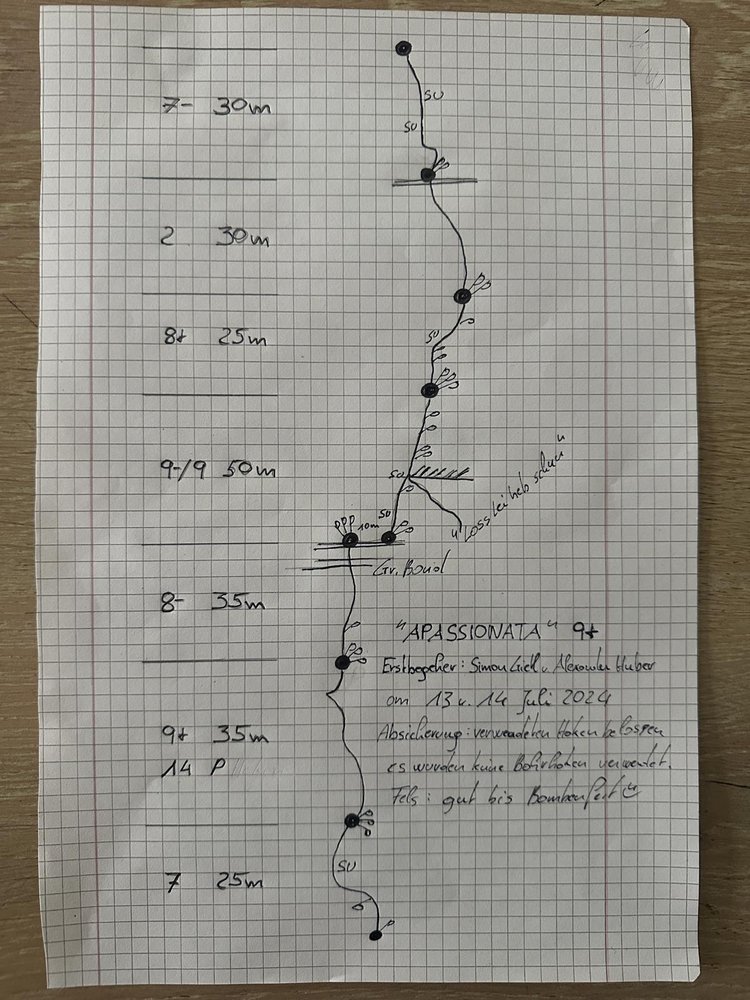 Am 13. und 14. Juli 2024 gelang Alexander Huber und Simon Gietl eine neue Erstbegehung am Heiligkreuzkofel in den Dolomiten. Die Route „APassionata“ erschließt einen direkten Einstieg zur bestehenden Linie „Loss lei heb schun“, die 2003 von Heli Gargitter und Renato Botte eröffnet wurde. Die Neutour folgt einer markanten, überhängenden Wandpassage, die bislang unberührt geblieben war – eine der letzten offensichtlichen Linien in diesem Wandbereich. Bereits Jahre zuvor hatten Heli Gargitter und Pauli Trenkwalder versucht, diese Linie anzugehen. Nach einer gründlichen Abseilaktion entlang der möglichen Route kamen sie jedoch zu dem Schluss, dass ein Durchstieg ohne Bohrhaken nicht realistisch für sie sei. Die Wand erschien in diesem Abschnitt zu glatt, zu abweisend – eine freie Kletterei unter Verzicht auf Bohrhaken schien aus damaliger Sicht unmöglich. Aus Respekt vor der Wand und in Übereinstimmung mit ihrer ethischen Haltung ließen sie das Projekt bewusst unberührt. Gietl und Huber nahmen die Herausforderung mit viel Entschlossenheit und Konsequenz an. Ihnen gelang es, die Linie im klassischen Stil von unten zu erschließen – vollständig ohne Bohrhaken. Die Route wurde technisch und teils frei eröffnet, wobei sie den logischen Verlauf durch den überhängenden, kompakten Fels suchten. Im oberen Bereich verbindet sich die Linie mit der Originalroute von 2003. Ein erster Versuch der Rotpunktbegehung am 15. August musste wegen einer Verletzung von Simon Gietl abgebrochen werden. Anfang August 2025 starteten sie einen neuen Anlauf. Einen Tag wurde Simon von seinem langjährigen Freund Andrea Oberbacher begleitet, wo er die Schlüsselseillänge ausgecheckt. Eine Woche später waren sie zusammen in der Wand und Simon konnte dabei von der Schlüsselseillänge bis zum Ausstieg alles rotpunkt klettern. Das Ziel von den beiden Alpinisten war es aber gemeinsam die Linie zu klettern. Am 25. August schließlich gelang Huber und Gietl die vollständige Rotpunktbegehung der gesamten Route.