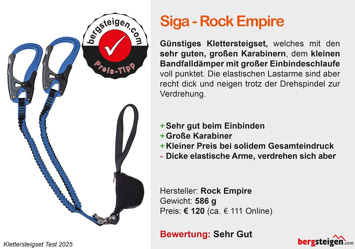 Rock Empire "Siga“: Das ganz neue Rock Empire "Siga" ist das günstigste Set in unserem Test. Sehr große, sehr gut zu bedienende Karabiner, ein kleiner Bandfalldämpfer der an einer großen Einbindeschlaufe hängt (das Ein- und Ausbinden geht damit wirklich sehr gut) zeichnen dieses Klettersteigset aus. Die elastischen Lastarme sind etwas dicker, in Kombination mit der nicht ganz perfekten Drehspindel neigt das Siga-Klettersteigset etwas zur Verdrehung. Highlight sind die großen, gut funktionierenden Karabiner, welche gut in der Hand liegen. Am Klettersteig funktioniert das Siga-Klettersteigset aber recht gut, man bekommt solide Klettersteigausrüstung für sein Geld.