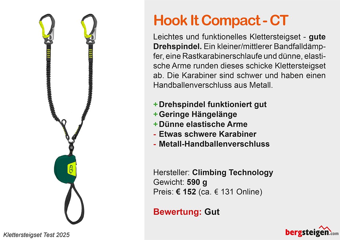 Climbing Technology "Hook It Compact": Leichtes, kompaktes und gut durchdachtes Klettersteigset, das vor allem durch seine Drehspindel positiv heraussticht! Die Spindel ist nicht ganz auf dem Niveau des Camp Ferrata-Sets, funktioniert aber doch recht gut. Die elastischen Arme verdrehen sich nicht so stark, bei kompletter Entlastung gibt es aber eine kleine Gegenbewegung. Direkt an der Drehspindel sind die elastischen Arme getrennt, das dürfte der Schlüssel zum Teilerfolg gewesen sein. Das Set hat eine gute Figur auf der Teststrecke gemacht, lässt sich sehr kompakt im Rucksack verstauen. Den Italienern ist ein sehr schönes Klettersteigset gelungen, vor allem die kompakte Bauweise und die recht gut funktionierende Drehspindel werden die Käufer dieses Sets freuen.