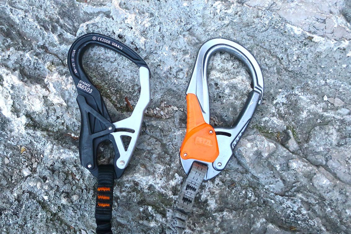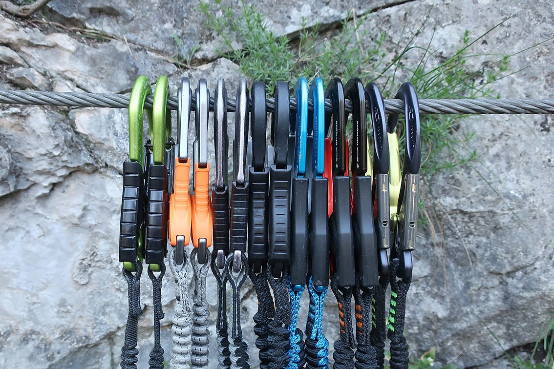 Bei diesem Punkt bilden sich deutlich zwei Gruppen aus – die meisten Klettersteigsets (Salewa, Edelrid, usw. ...) haben einen recht großen Klettersteig-Karabiner mit Handballenbedienung, andere (Petzl) haben einen kleineren Karabiner. Mit seinem sehr großen "Nasenkarabiner" hat Salewa bei den Karabinern die Nase vorne - größte Öffnung und das Stahlseil lässt sich sehr gut damit "einfangen". Dicht dahinter Edelrid und Rock Empire - wobei bei kleinen Händen das Petzl Set zu den großen Favoriten gehört - auch der "kleine" Petzl Karabiner hat eine recht große Öffnung von 3,5 cm! Bei dem Set von CT haben die Karabiner noch einen aus der Mode gekommenen Metall-Handballen-Verschluss.