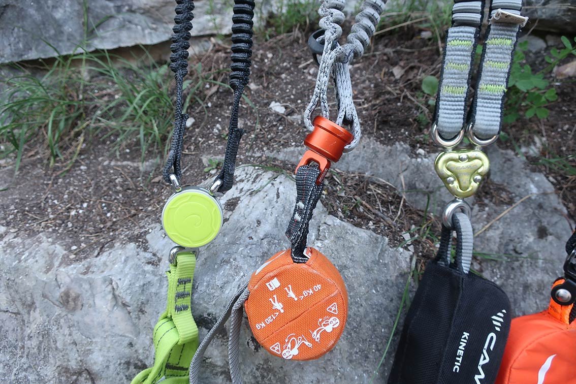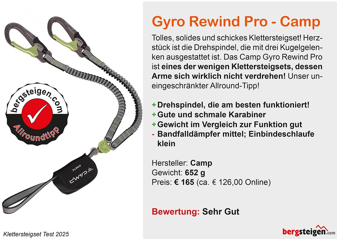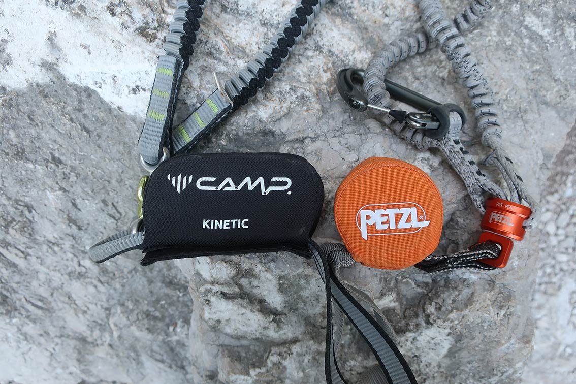 Camp „Kinetic Gyro Rewind Pro“: Die Italiener haben mit dem Gyro Rewind Pro einen ganz großen Trumpf in der Hand - die extrem gute Drehspindel, die sehr gut funktioniert! Herzstück ist die Spindel, die mit drei Drehgelenken ausgestattet ist. Das Gyro Rewind Pro ist eines der wenigen Klettersteigsets, dessen Arme sich wirklich nicht verdrehen. Die Karabiner sind ausreichend groß und lassen sich leicht bedienen und finden dank ihrer schmalen Schnapper Konstruktion auch in engen Kettengliedern noch Halt (dort wo dicke Karabiner nicht mehr durchpassen). Der Bandfalldämpfer ist klein/mittel. Das Gyro Rewind Pro ist ein durchwegs solides Klettersteigset, im Großen und Ganzen sehr hochwertig ausgeführt und sehr gut zu bedienen.