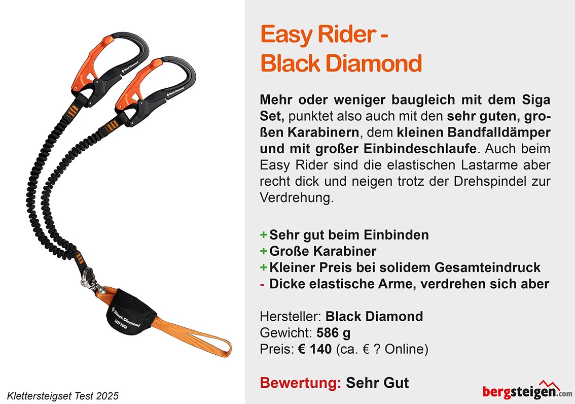 Black Diamond "Easy Rider“: Das Easy Rider Klettersteigset war vor vielen Jahren mit seinen futuristischen Karabinern eine Legende und wurde jetzt neu aufgelegt. Es ist quasi baugleich mit dem Siga Klettersteigset von Rock Empire, außer die Farbgebung wurde dem alten Easy Rider Set angeglichen. Absolutes Highlight sind die sehr großen, sehr gut zu bedienenden Karabiner, ein kleiner Bandfalldämpfer der an einer großen Einbindeschlaufe hängt (die Einbindeschlaufe ist minimal kleiner als beim Siga Klettersteigset, das Ein- und Ausbinden geht damit perfekt) zeichnen dieses Klettersteigset aus. Auch das Easy Rider Klettersteigset neigt etwas zur Verdrehung. Es gibt eine Metallöse für den Kurzfixkarabiner. Beim Einsatz am Klettersteig funktioniert das Easy Rider Klettersteigset aber sehr gut, in der Preisgestaltung ist das Black Diamond Easy Rider Set mit 140 Euro auch im unteren Bereich, weshalb es sicher gut angenommen wird. Erhältlich vrs. ab Sept. 2025.