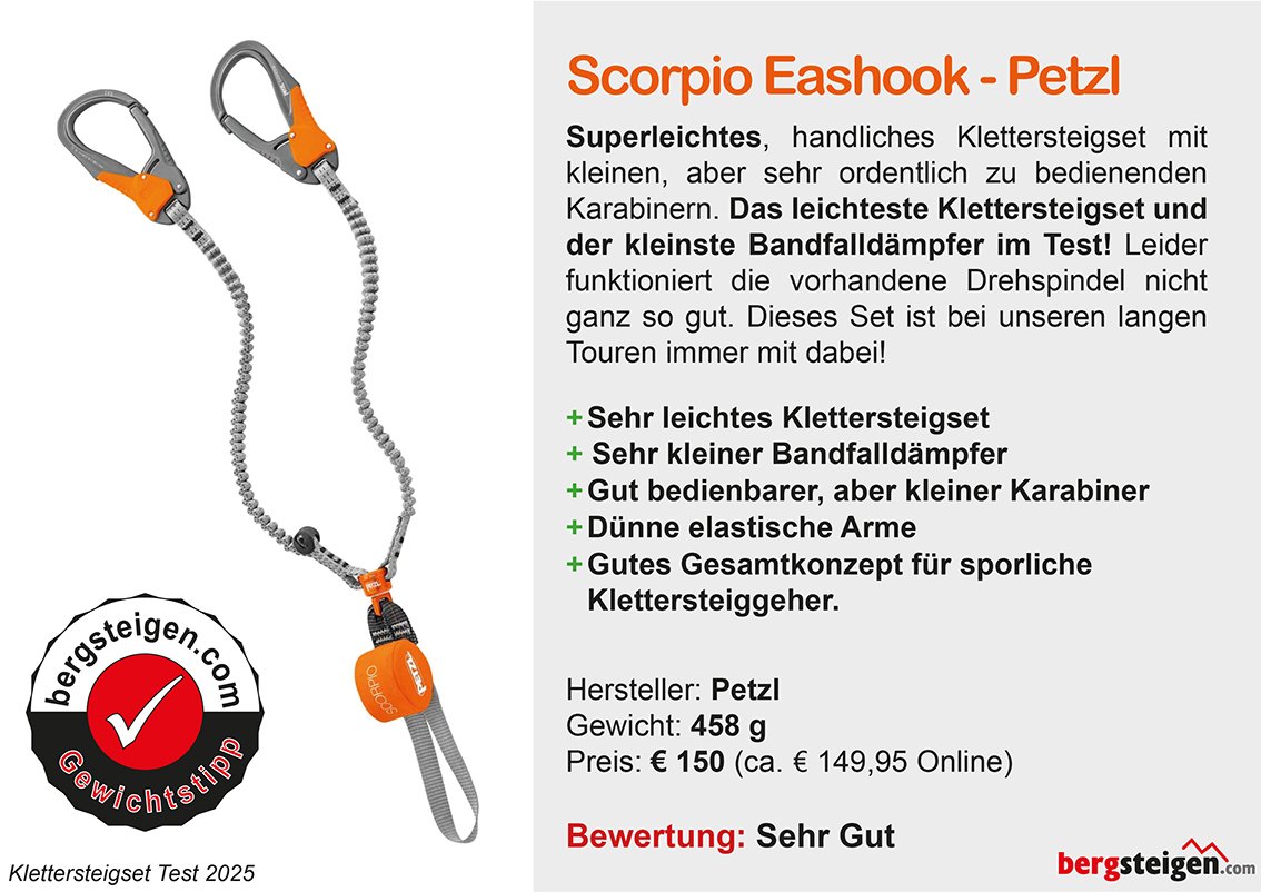 Petzl „Scorpio Eashook“: Petzl hat sein Set mit Erfolg überarbeitet und das Ergebnis kann sich sehen lassen! Kleinster Bandfalldämpfer auf dem Markt und das leichteste Klettersteigset mit Drehgelenk sprechen schon für sich. Der neue Karabiner ist erstaunlich gut zu bedienen (auch mit kleinen Händen!). Die orange Alu-Drehspindel funktioniert aber nicht ganz so gut wie die Dreifach-Spindel von Camp oder Edelrid. Das Petzl-Set hat aber einen sehr großen Pluspunkt, es ist mit Abstand das leichteste Set im Test und sehr kompakt! Alpinisten werden diesen Umstand positiv zu schätzen wissen, denn auf langen Klettersteigtouren tut man sich mit leichter Ausrüstung naturgemäß einfach etwas leichter; sehr gut ist auch die kurze Hängelänge (77 cm) im Vergleich zur verbesserten Spannweite 185 cm. Petzl klopft mit dem neuen Scorpio Eashook direkt beim Testsieger an - extrem leicht, kleinster Bandfalldämpfer, sehr gutes Gesamtkonzept!