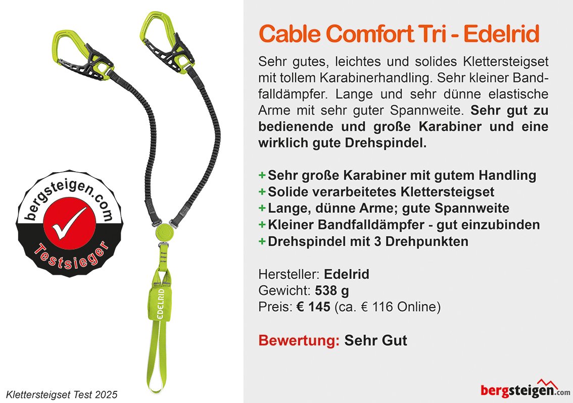 Edelrid „Cable Comfort Tri“: Das Herzstück ist die 3-fach Drehspindel, die auch wirklich gut funktioniert. Der große Karabiner ist bei gleichbleibenden Eigenschaften noch leichter geworden! Der Bandfalldämpfer ist sehr klein. Schön und angenehm sind auch die dünnen, elastischen Arme, welche solide und sehr eng abgenäht sind, auch das Gewicht von 538 Gramm kann sich sehen lassen! Ein solides, qualitativ hochwertiges Set, welches als einziges 2025 Klettersteigset in den meisten Bereichen gut punktet. Das Cable Comfort Tri Klettersteigset: Große Karabiner, dünne Lastarme, kleiner Bandfalldämpfer und sehr gute Drehspindel