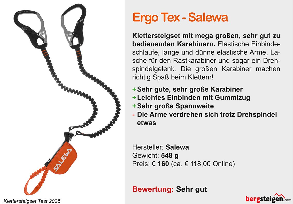 Salewa „Ergo Tex“: Beim Salewa Klettersteigset fällt vor allem eines auf - der mega große Karabiner. Der hat Vorteile im Handling, man kann das Stahlseil einfacher "einfangen" und er verhängt sich nicht so schnell am Anker wie kleinere Karabiner. Diese Art/Form der Karabiner kennt man nur aus der Arbeitssicherheit, trotz des großen Karabiners ist das Set nur unwesentlich schwerer. Zusätzlich hat das Ergo Tex Klettersteigset eine sehr große Spannweite, was beim Wechsel zwischen Seilen oder auf Seilbrücken auch kein Nachteil ist. Gesamt hat Salewa mit dem Ergo Tex ein sehr gutes und mit 548 Gramm auch ein recht leichtes Set abgeliefert. Das Ergo Tex wäre ganz vorne mit dabei, leider fehlt diesem Set aber eine gut funktionierende Drehspindel.