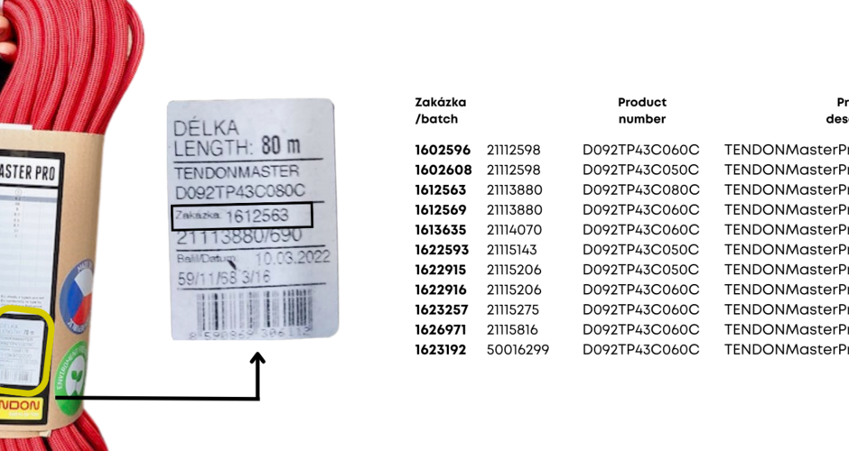 Lanex a.s. informiert seine Kunden, dass ein Teil der hergestellten Kletterseile TENDON Master Pro 9,2 mm, CS als Vorsichtsmaßnahme vom Markt zurückgerufen wird.