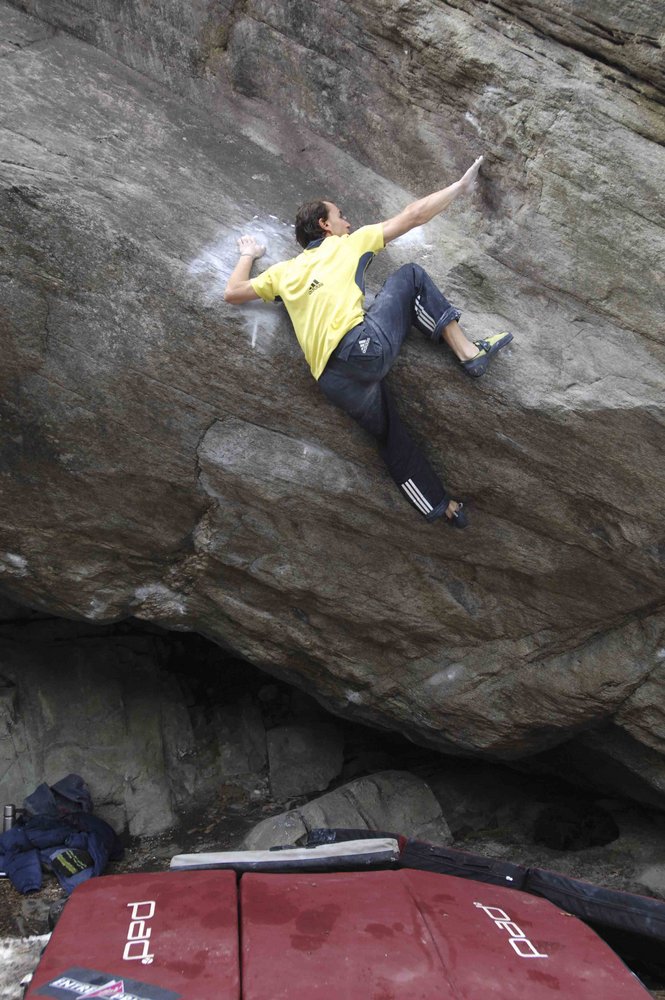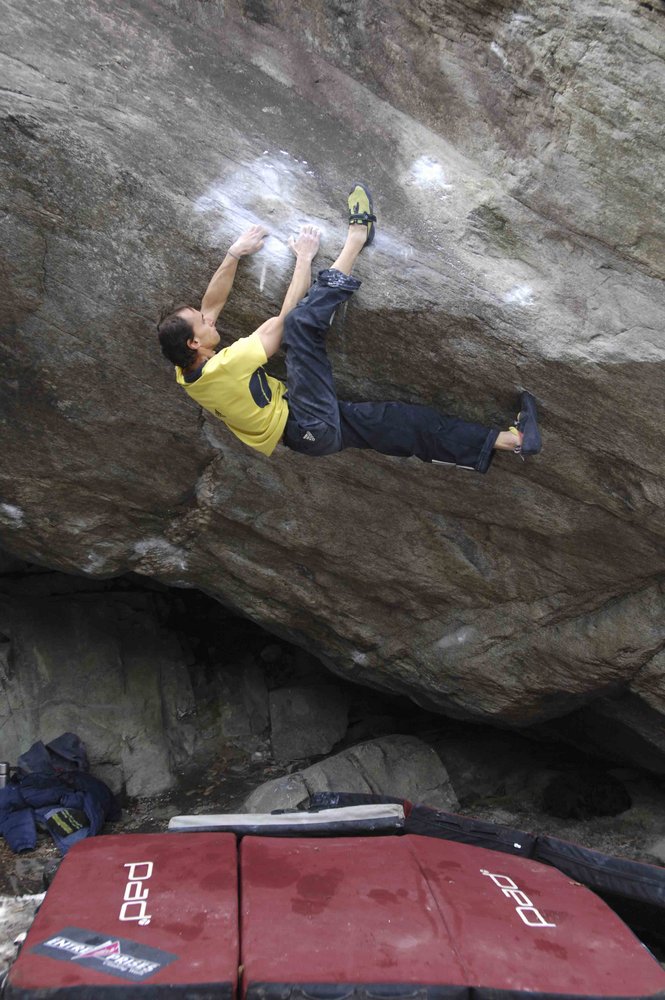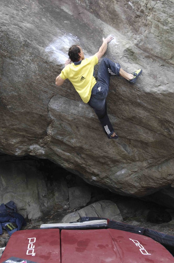Zuerst gelang ihm in Osogna die dritte Begehung von „DIPENDE“. (fred nicole, 2005 ) Dieses diffiziele Wandproblem wurde zwar von vielen Newcomern probiert, konnte aber bisher nur vom Engländer Tim Clifford wiederholt werden, der ein Spezialist für solche „kleingriffige“ Wandklettereien ist. Am 20. Feb. konnte Bernd die 5 moves erfolgreich aneinander reihen ...und eine der genialsten Wandklettereien lösen, die ihm je unter die Finger gekommen sind. Interessant, dass dieses Problem nicht desöfteren auf diversen scorecards aufscheint:-)