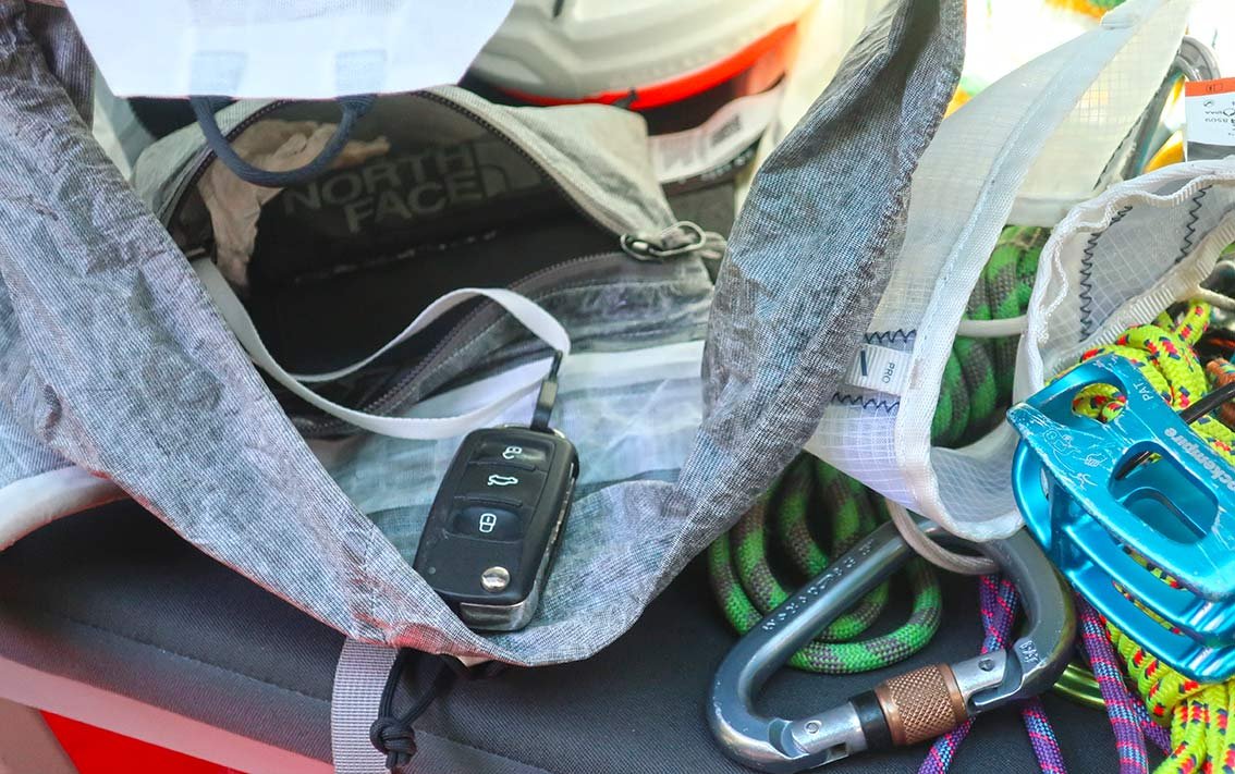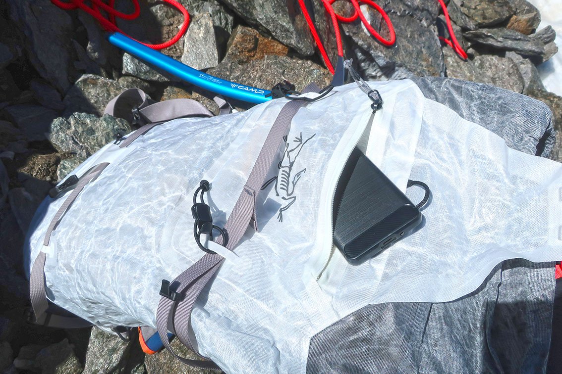 Im Arcteryx Alpha SL 30 gibt es sogar zwei Zipptaschen - eine innen, dort wird bei uns z.B. die Stirnlampe und der Autoschlüssel (für den gibt es ein eigenes Sicherungsband) verstaut. Außen ist noch eine schnell zugängliche Zipptasche, in der wir das Handy und sonst noch ein paar Kleinigkeiten (Pickelschutz etc.) aufbewahren. Die beiden Taschen sind gut gelungen und ausreichend groß, bei anderen ultraleicht Rucksäcken sucht man diese Art von Zipp-Taschen meist vergebens bzw. muss man meist nur mit einer Tasche vorliebnehmen.