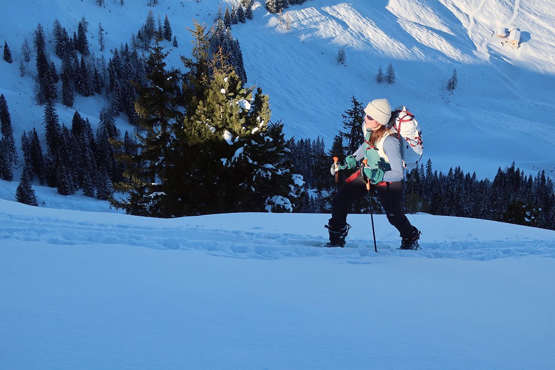 Die zweite Tour mit dem Ripstick Tour 94 führte uns dann ins Gelände, genau genommen wurde der Lämpersberg in der Wildschönau auf der uns schon sehr gut bekannten klassischen Nordost-Route bestiegen. An diesem Aufstieg gibt es auf Höhe der Baumgartenalm eine schmale, steile Gratpassage, an der viele Skitourengeher oft verzweifeln, weil man im steilen Gelände einige Spitzkehren machen muss. Mit einer Mittelbreite von 94 mm ist der Ripstick Tour nicht weit weg von den 100er Modellen und auch ganz etwas anderes als die von uns oft verwendeten 75 bis 78 cm (Mittelbreite) Trainingsskier. Aber auch hier machte der Ripstick Tour 94 bei den Kick-Turns im steilen Gelände eine gute Figur, das Gewicht lässt sich gut um die Ecke bringen.