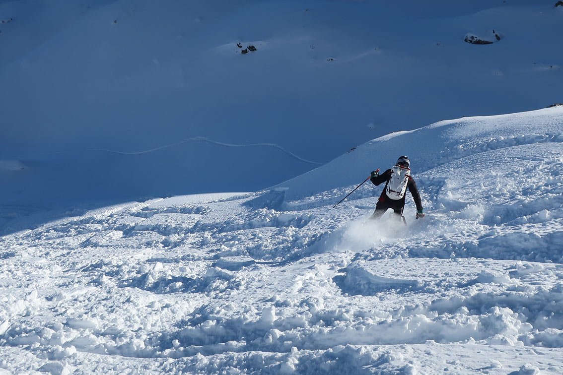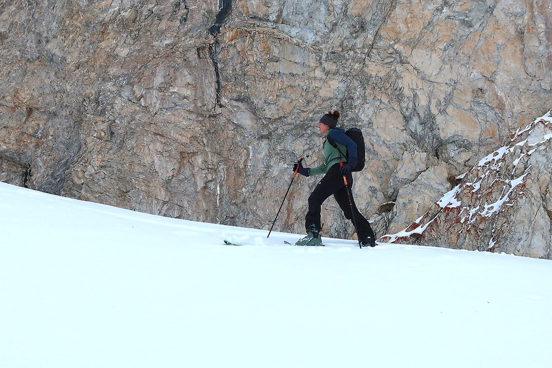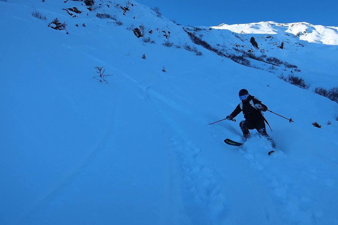 Im freien Gelände, bei der Abfahrt durch das oben und im Mittelteil recht steile Ostkar haben wir unterschiedlichste Schneebedingungen, etwas gepresster Pulver, dann im mittleren, recht steilen Teil guter Pulverschnee und unten wieder etwas anspruchsvolleren Pressschnee. Der Ripstick Tour 94 lässt sich da recht präzise zwischen den Büschen hindurch, mit engen Schwüngen abwärts bewegen und auch im schlechten Schnee ganz unten machte sich die 94er-Breite positiv bemerkbar! Mit dem Elan Ripstick Tour 94 hat man also für fast alle Bedingungen einen soliden Begleiter unter den Füßen, egal ob beim Aufstieg oder der Abfahrt (ein Ski sowohl für das freie Gelände als auch die Skipiste).