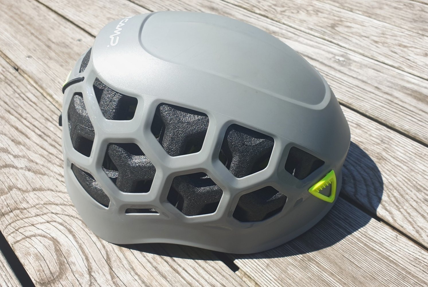 Der Camp Ikon-Helm ist in einer speziellen Hybridbauweise ausgeführt, welche die Robustheit klassischer Hartschalenhelme mit dem Komfort und der Schutzwirkung moderner In-Mold-Technologie verbindet. An den Seiten und hinten hat er 18 Belüftungsöffnungen. Dort und an den Kanten des Helms ist die darüberliegende ABS Außenschale zusätzlich geformt, um den Camp Ikon Helm noch steifer und stabiler zu machen. Die Verbindung von Außen- und Innenschale ist beim Camp Ikon Helm auch ein richtig guter optischer Hingucker, die wabenförmige Struktur hebt sich von anderen Kletterhelmen schön ab.
