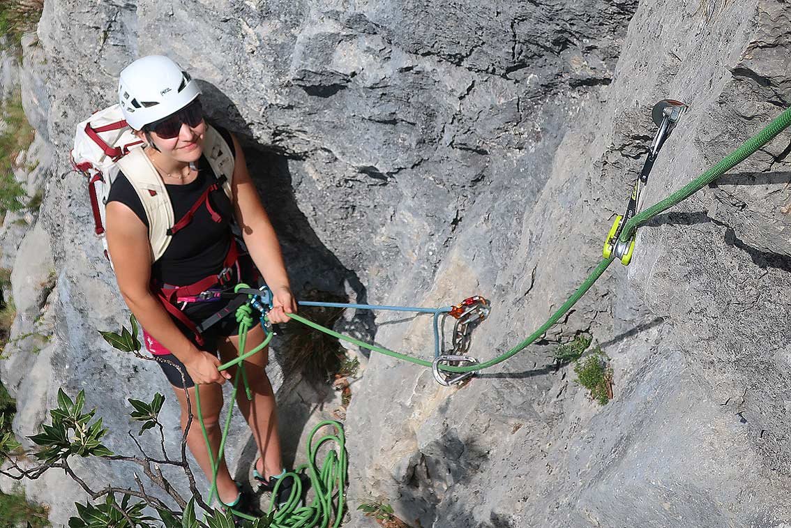 Bei Kletterrouten in Arco gibt es oft auch gemischte Absicherung – also z.B. einen Normalhaken oder eine Sanduhr nach dem Stand und dann erst ein Bohrhaken. Dann hängt man in die Sanduhr zuerst eine normale Expressschlinge und in den darauf folgenden Bohrhaken erst das Edelrid Ohmega ein.