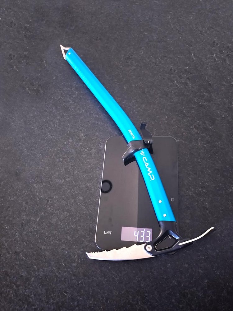 Den Zenith gibt es in drei verschiedenen Längen (50, 57 und 65 cm), das Gewicht wird von Camp mit (418, 428 und 440 Gramm angegeben). Der leicht gebogene Schaft mit den Griffrippen und dem schnell verstellbaren Tigger (Handauflage) verleihen dem Zenith eine schöne Form. Oben beim Hauenelemet gibt es eine große Öffnung (auch für den Leash-Karabiner), mit welcher der Zenith beim Gehen sehr gut in der Hand liegt.