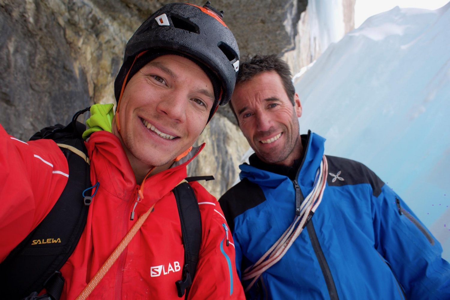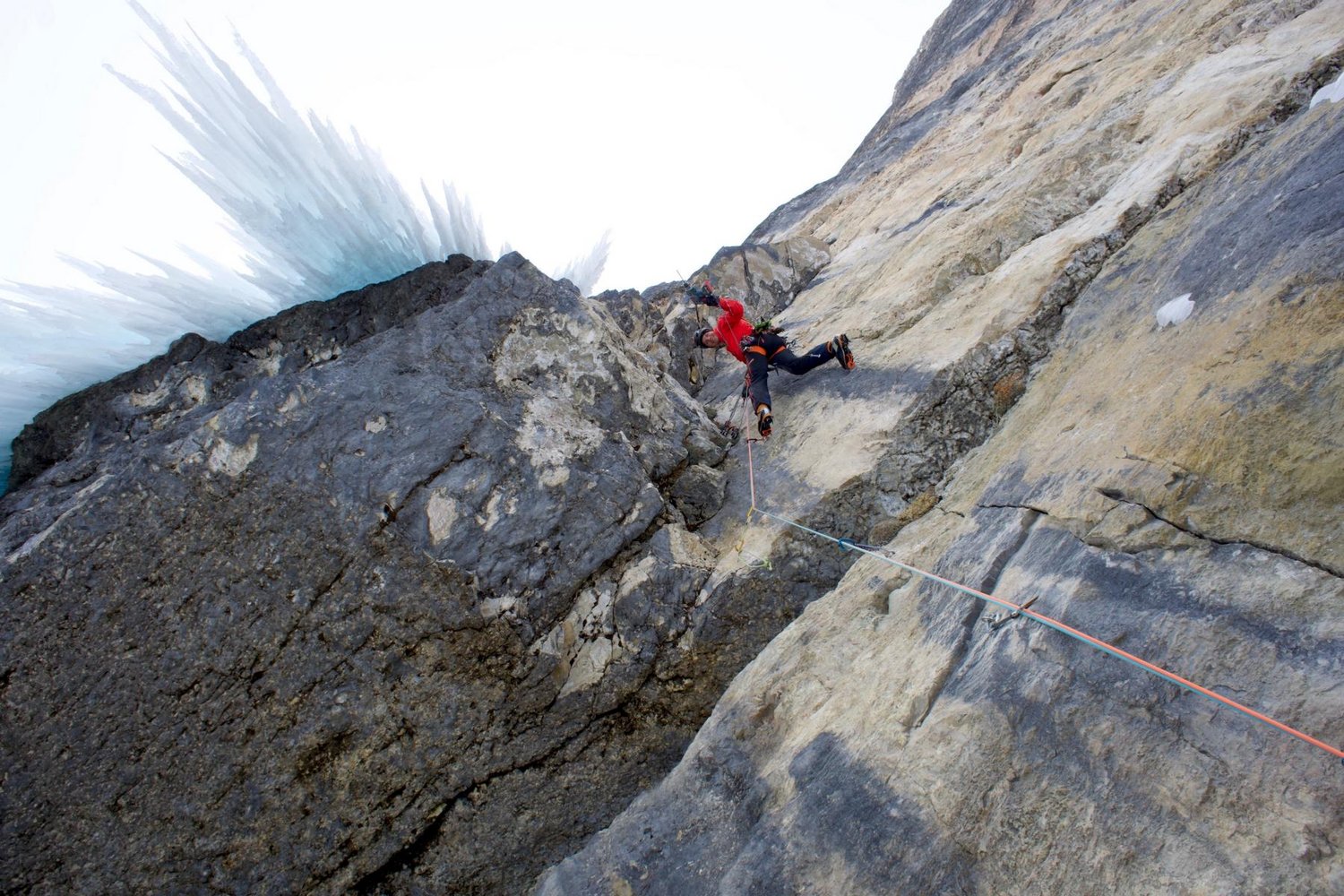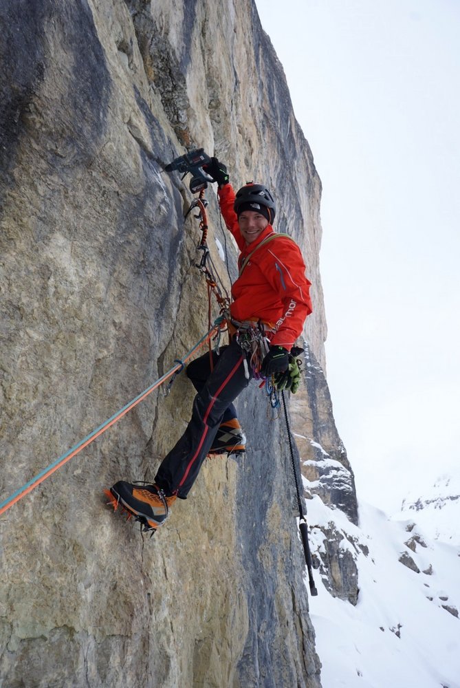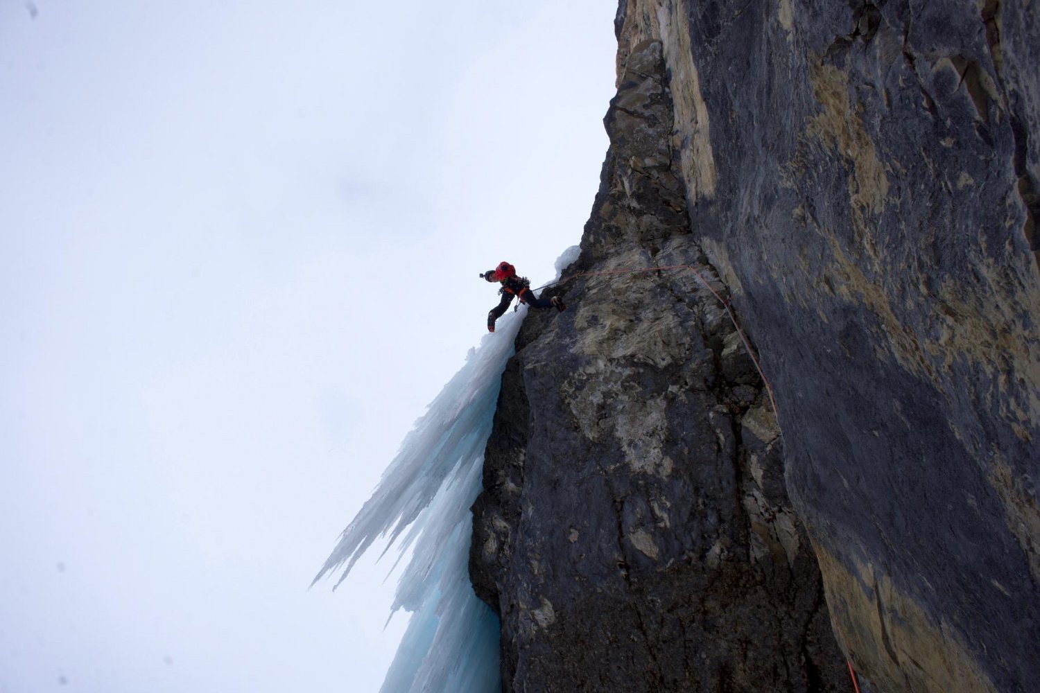 10 Expressschlingen, komplette Eisausrüstung, 5-6 Eisschrauben. Gute Absicherung mit Bolts