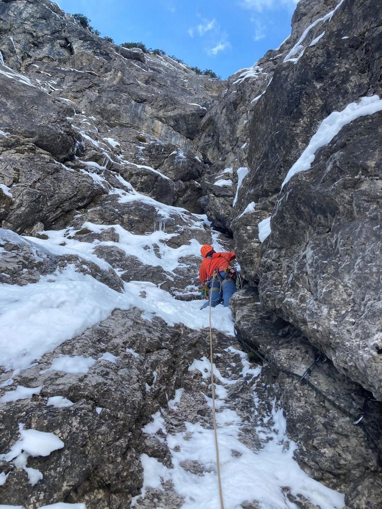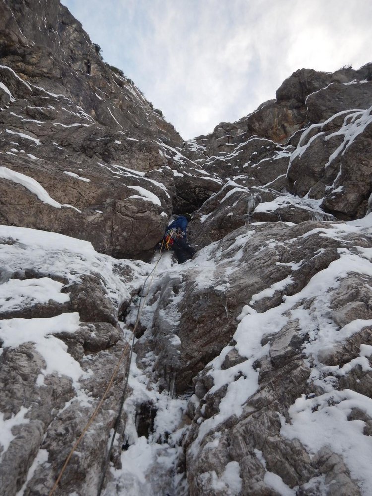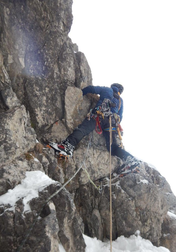 2. Länge: M5, 25m: Entlang des schönen Risses bis zu einer kurzen überhängenden Verschneidung. Diese hoch und der Rinne weiter nach rechts folgen bis zum gebohrten Stand. Gute Absicherung an Cams und Klemmblöcken. Es existieren 2 gebohrte Stände, aufgrund der völlig unterschiedlichen Schneeverhältnisse die an den zwei Tagen der Erstbegehung angetroffen wurden.