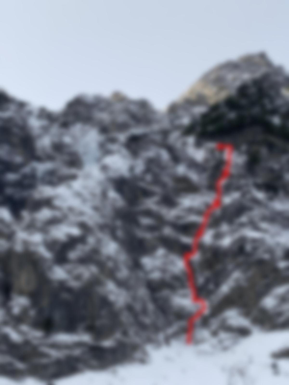 Vorsicht: Über der Rinne befindet sich eine nordseitig ausgerichtete 45° Rinne. Bei erhöhter Lawinengefahr besser nicht einsteigen!