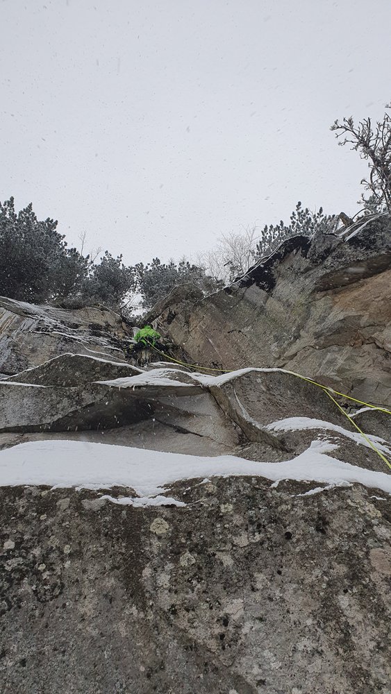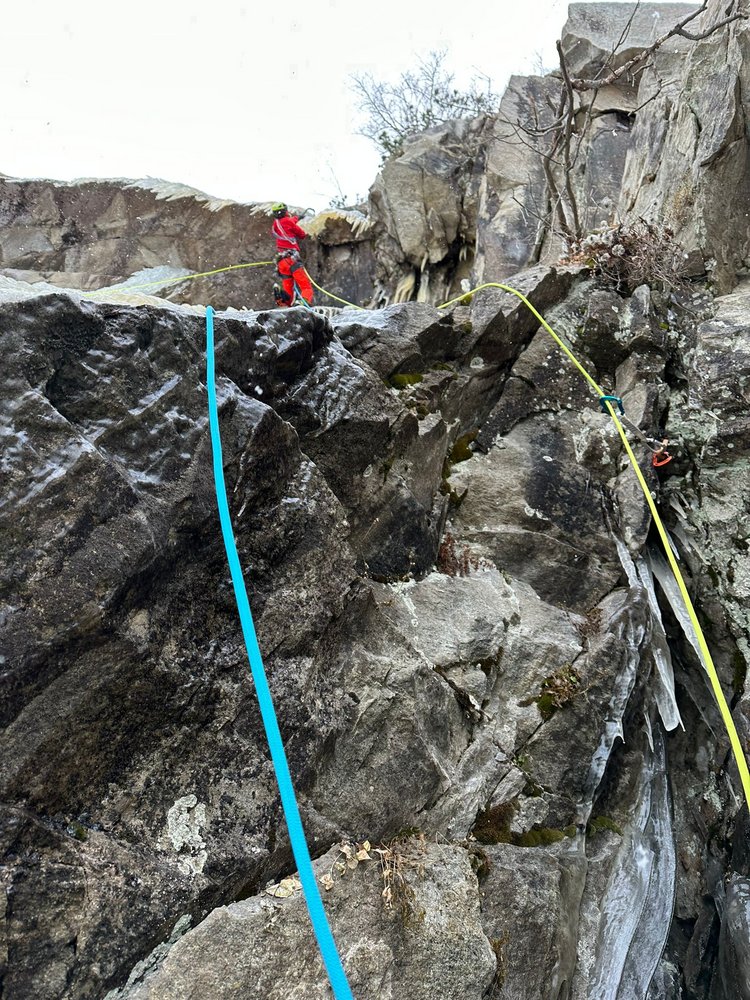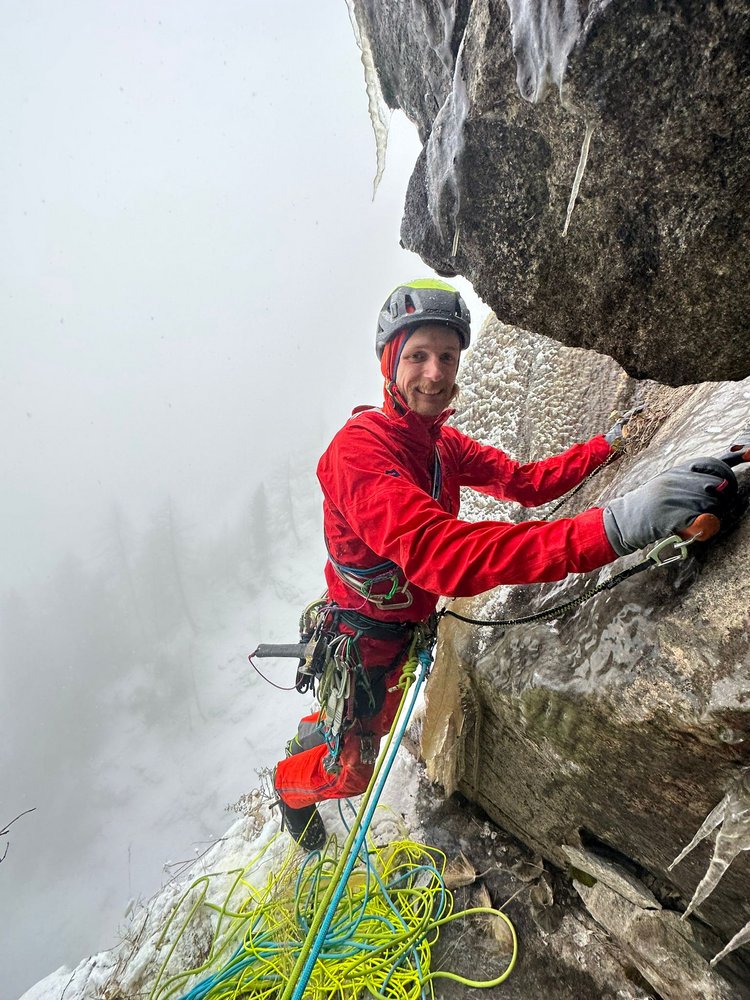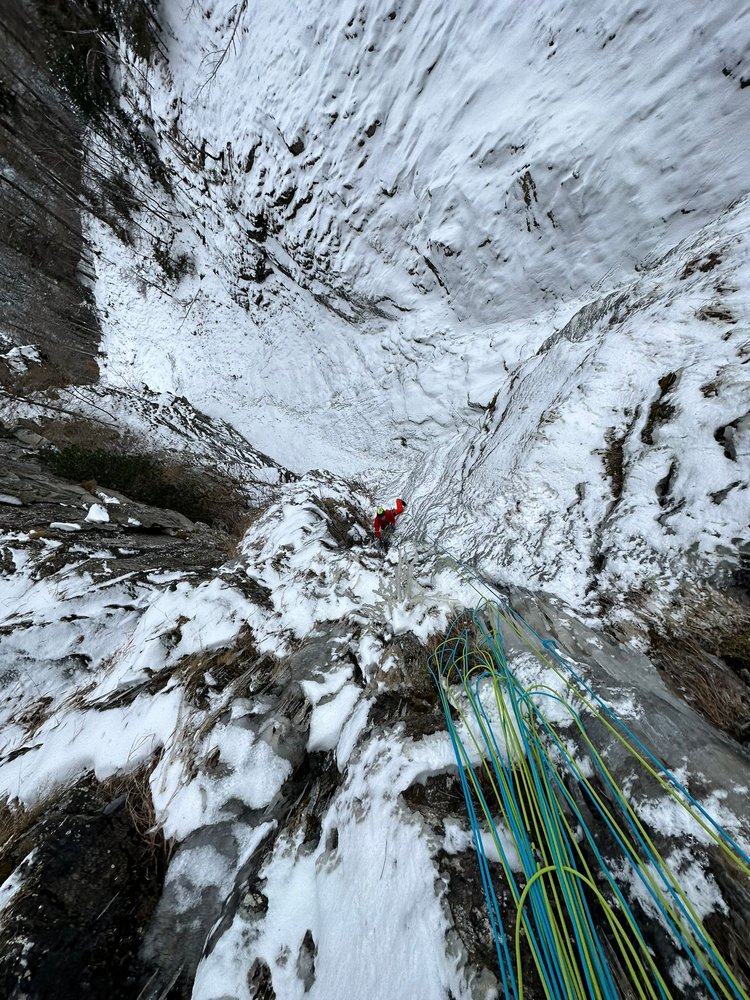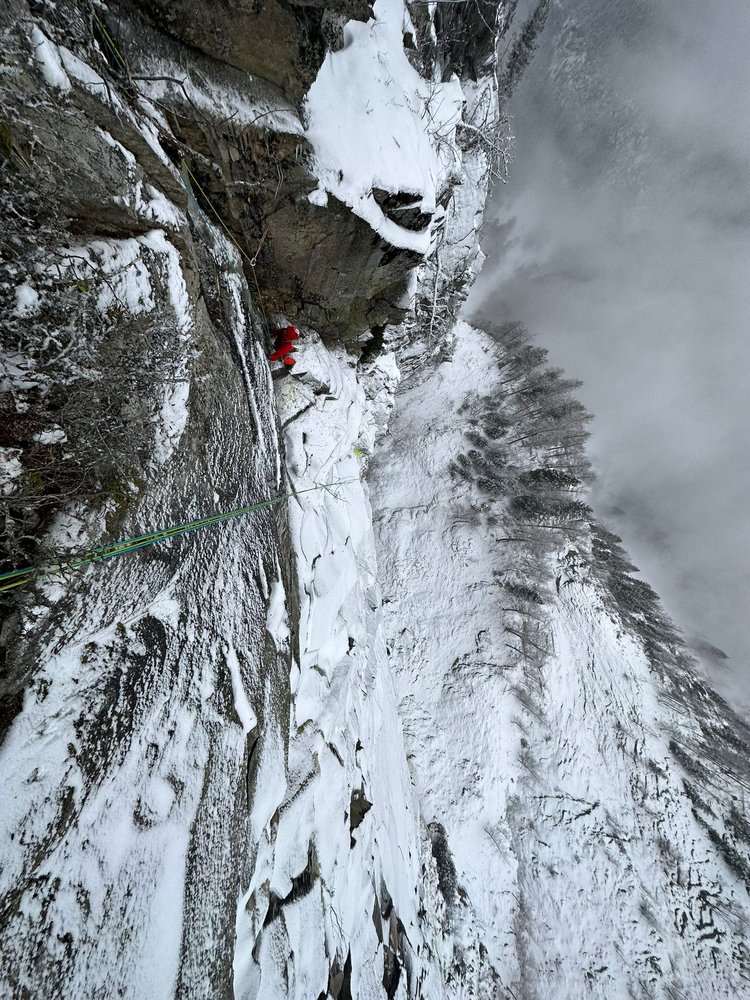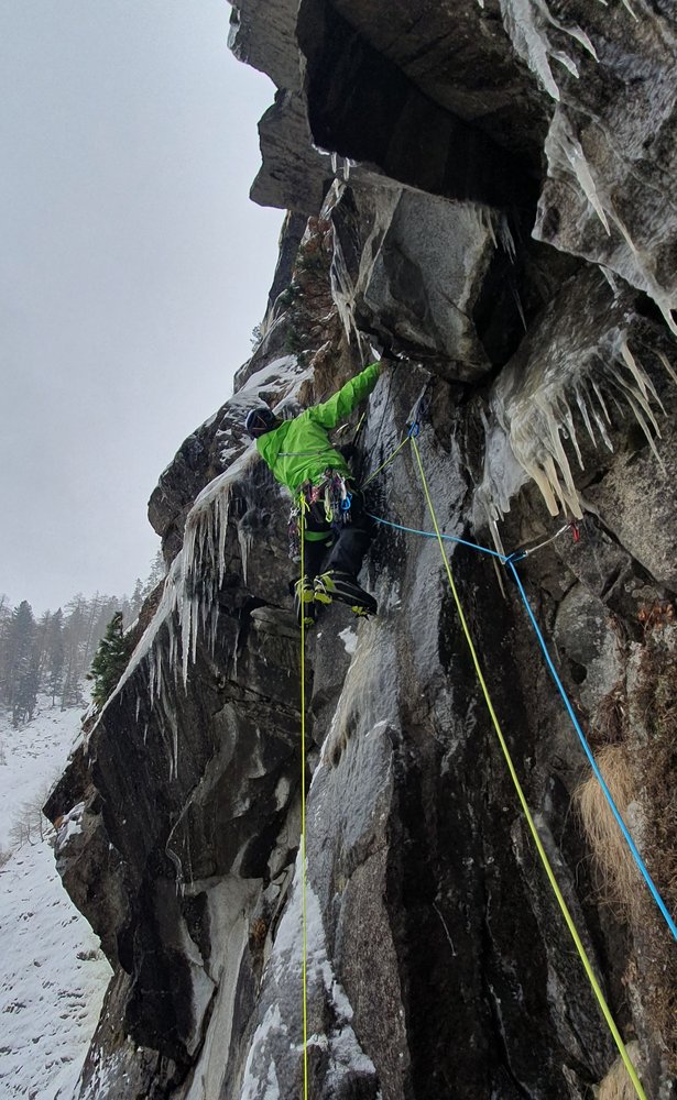 Nach "Stalingrad" (1000m, M8 WI 7) und "Ethik Gärtner" (160m, WI 7) ist dies nun das dritte Mal, dass ich diese Bewertung ausgebe. Affogato" hat per Definition genauso wenig mit WI 7 zu tun wie "Stalingrad". Letztere war viel zu gefährlich für den Grad und hatte eigentlich gar kein richtiges Eis, "Affogato" hingegen ist viel zu sicher. Das Eiskletterkönnen erfordert nicht mehr als WI 4, gemischt mit körperlicher Anstrengung von M8/9. Spätestens wenn die Füße mit den Eisgeräten im Eis oberhalb des Daches kommen und man die 10cm-Schraube in der Glasur unter dem Dach sieht, werden wohl alle Wiederholer wissen, warum wir nicht WI 6 gegeben haben.
