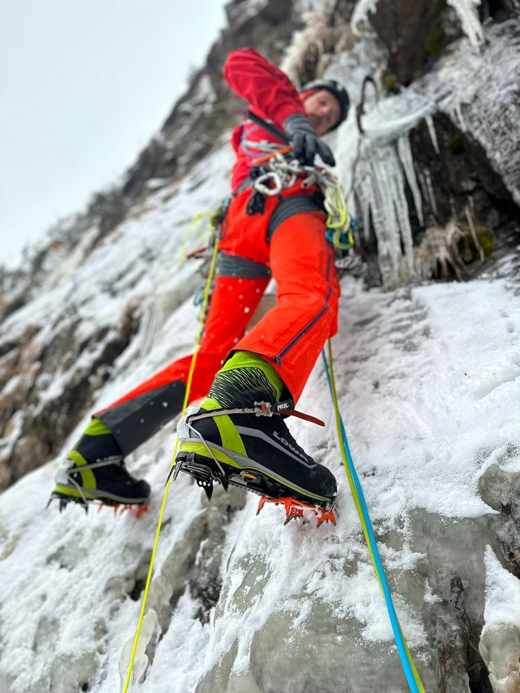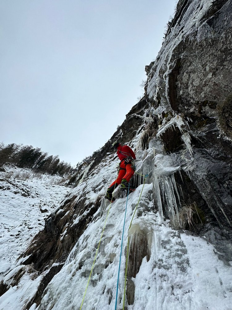 "Affogato" bietet über 5 Seillängen phantastische Glasur-Kletterei, gerade dick genug für die 10cm Eisschrauben mit einer einzigartigen athletischen Crux-Seillänge über ein 1,50m ausladendes vereistes Dach. Es ist eine sehr umsichtige Schlagtechnik in den ersten 3 schottisch angehauchten Seillngen notwendig, damit die Hauen in der Schlüssellänge noch scharf genug sind.