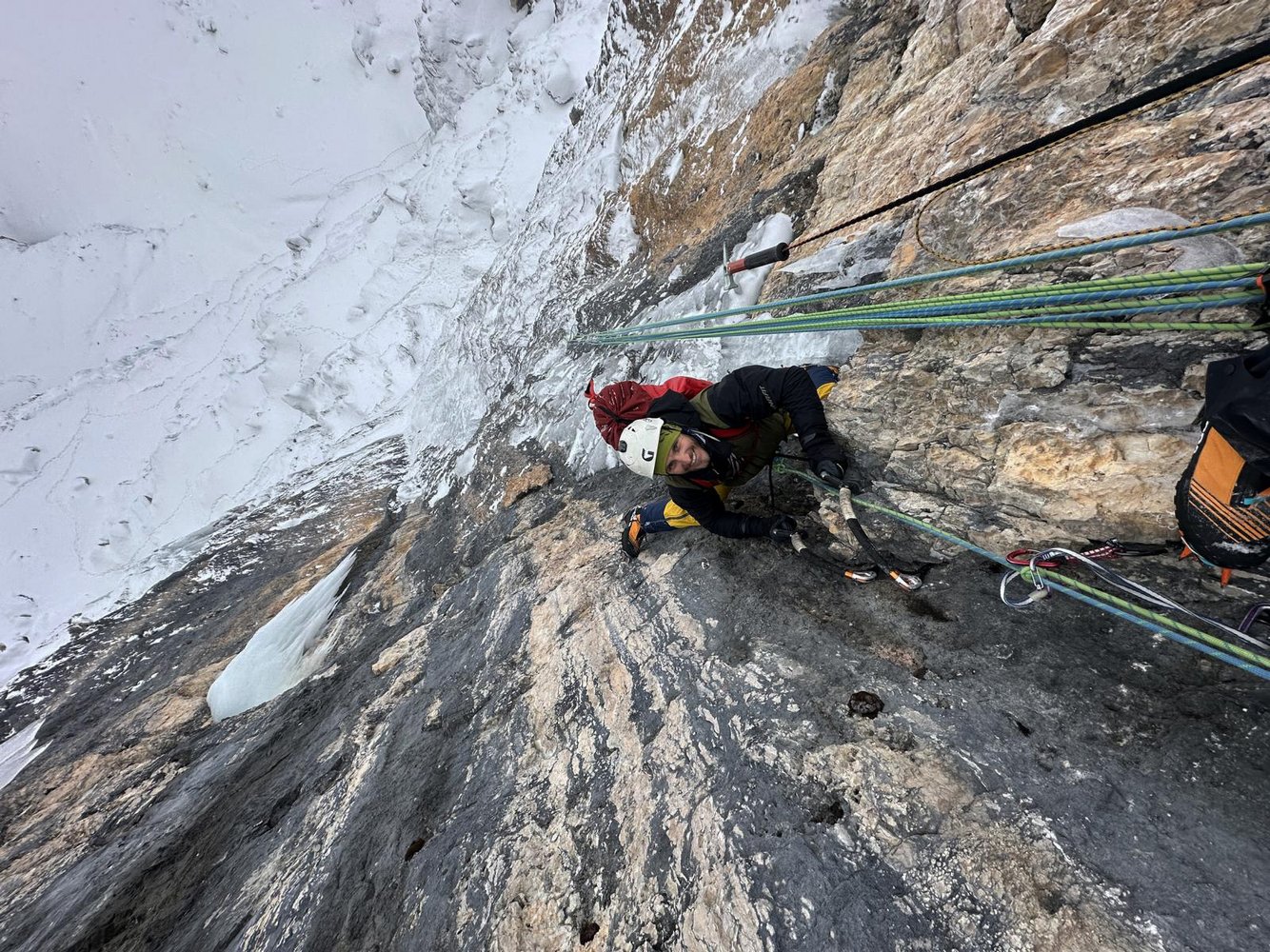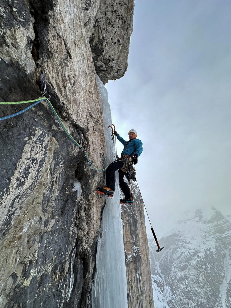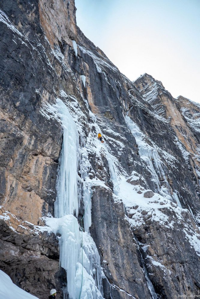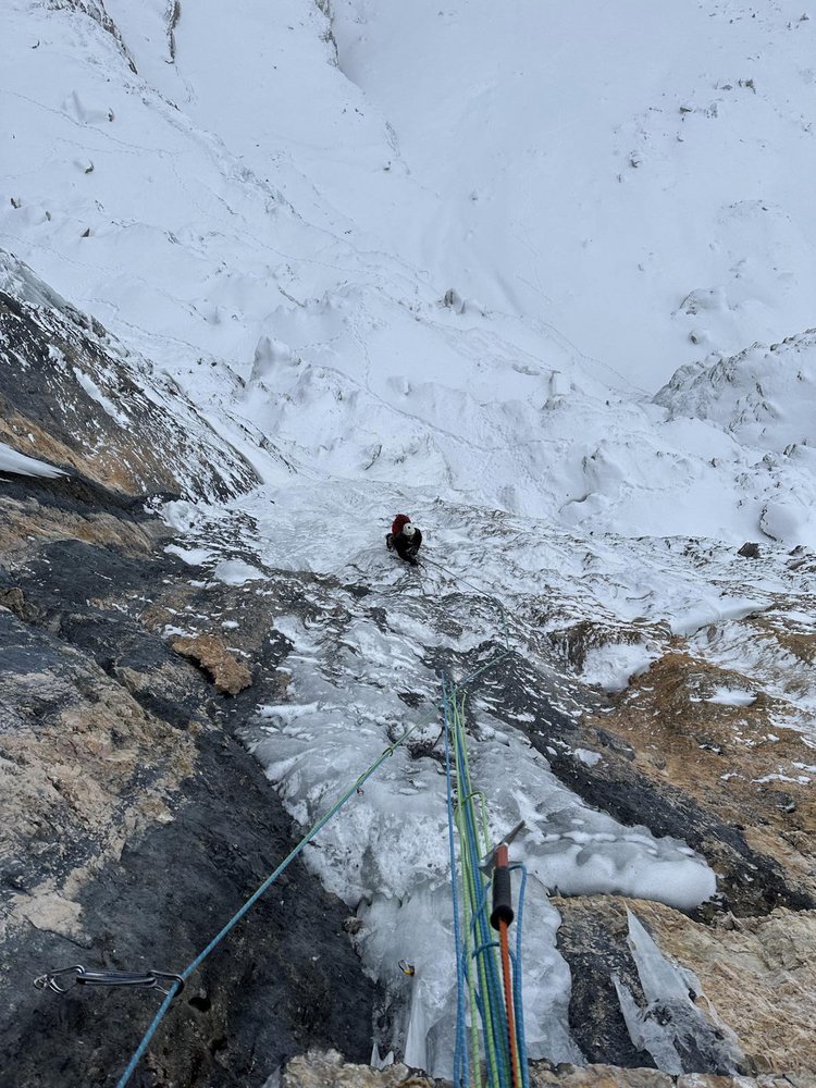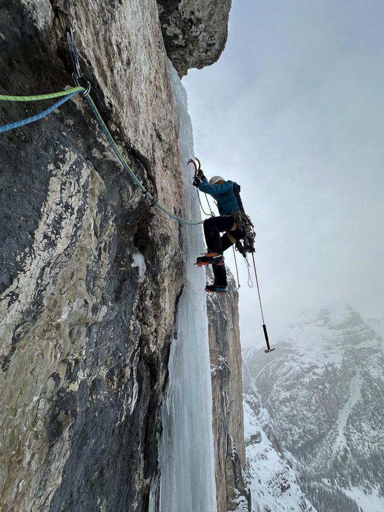 - 15m M8 WI5+Nach rechts über einen super überhängenden Riss zur hängenden Eiskerze, diese hoch und stand im Eis