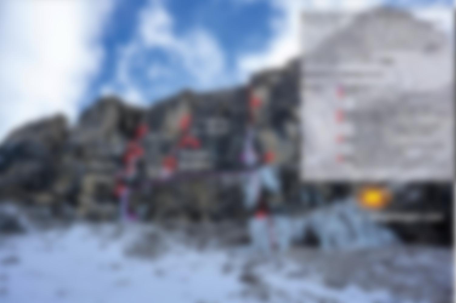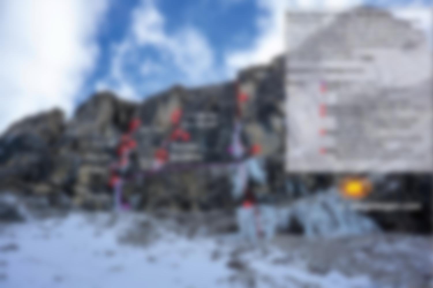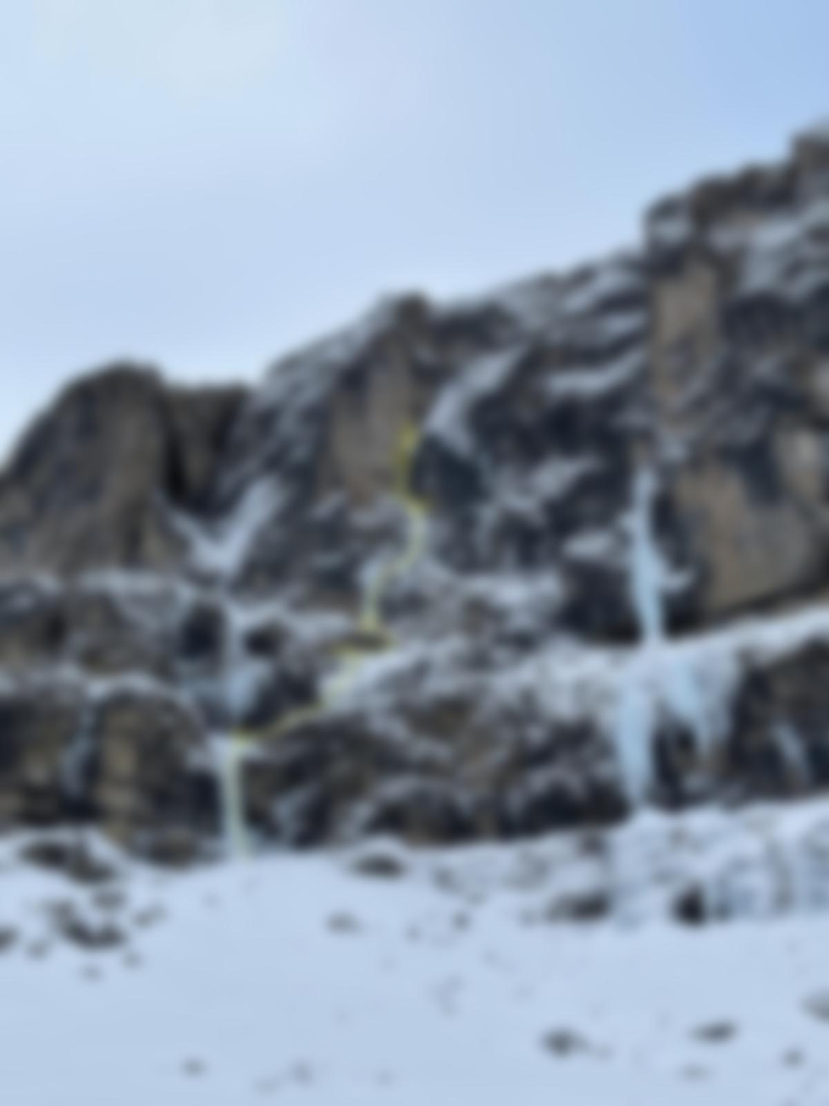- 25m M8 WI 5+ Vom letzten Eispolster zuerst nach links dann durch die markante Verschneidung zum stand.