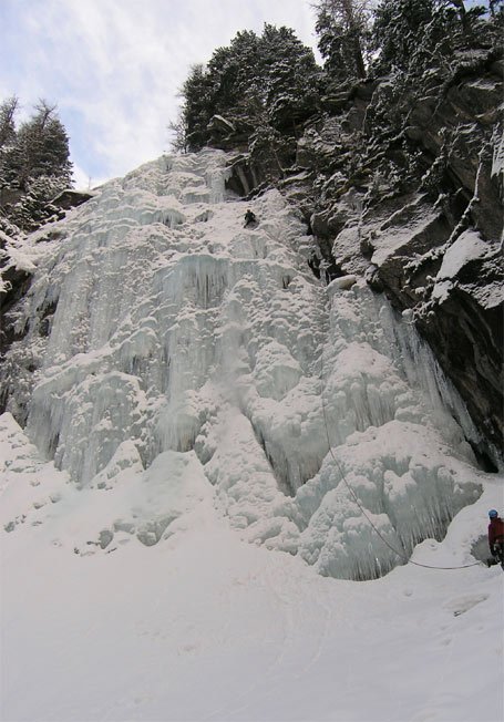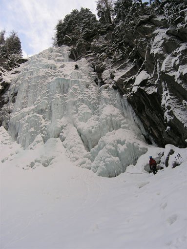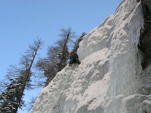 Schöner Fall gleich beim "Waldgasthof" in der Prossau. Der Fall hat meist etwas "kohlige" Eisbedingungen. Er schaut deutlich leichter aus als er ist.