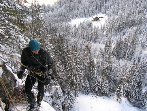 Zuerst im Wald absteigen, dann abseilen an Bäumen (von unten gesehen rechts vom Fall).