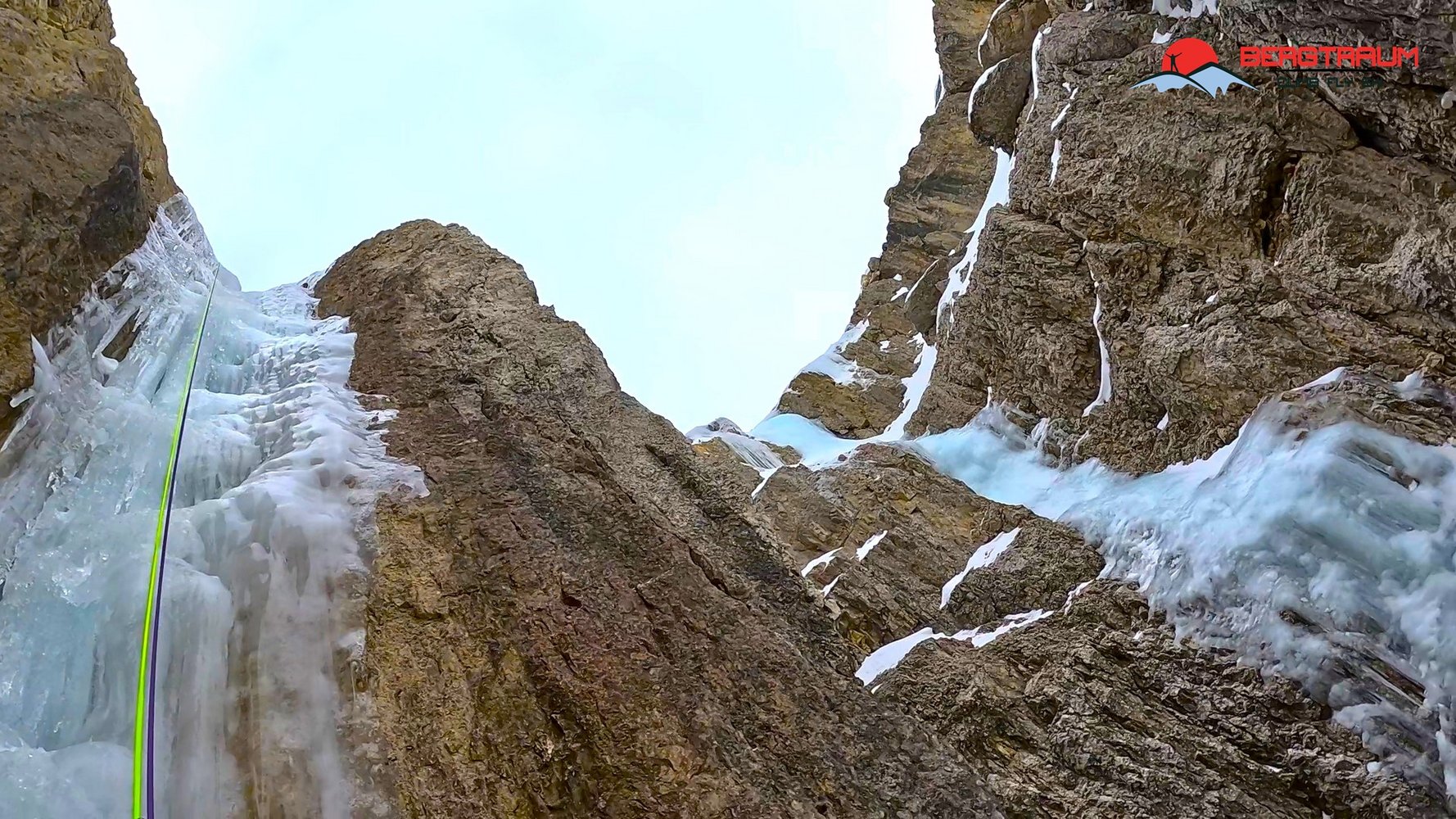 In der linken Linie finden sich am linken Rand zwei bolts im Fels, sowie ein gebohrter Stand am Ende mit zwei bolts. Ansonsten an Abalakovs abseilen. Die rechte Tour hat im unteren Teil oft sehr wenig Eis und ist dann nicht wirklich absicherbar.