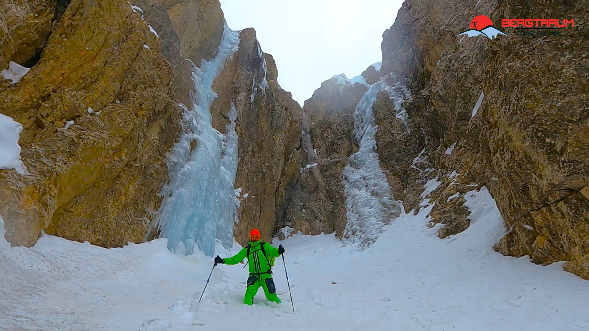 Die beiden Eislinien (bei guten Bedingungen gibt’s auch noch eine dritte Möglichkeit in diesem Kessel), sind gut vom Zustieg aus zu sehen.