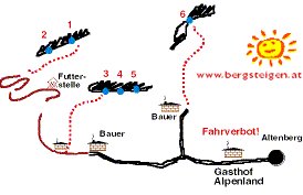 Beim vorletzten Bauernhof rechts in den Graben und unangenehm 1 h aufwaerts, (den Wasserfall sieht man schon vom Ortsende Altenberg, rechts hinten in einem Winkel, siehe Zufahrtskizze unter Übersicht!)