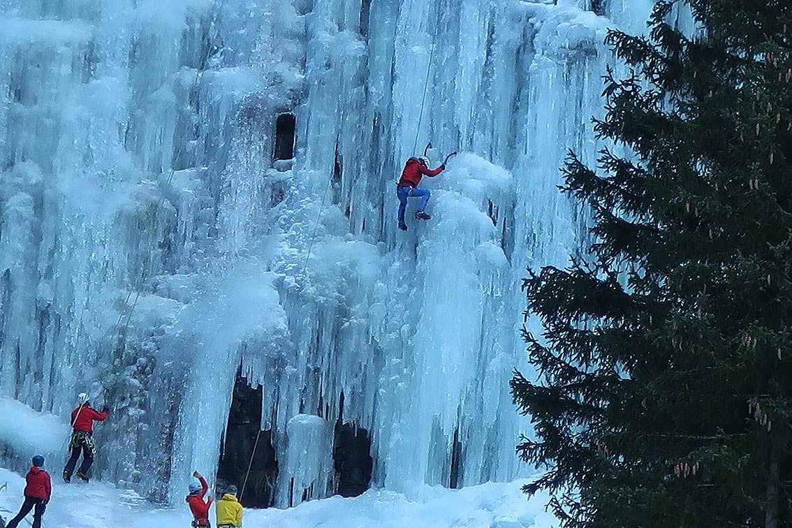 Der Eisfall ist oft sehr gut besucht - oft sind Kurse und Anfänger an dem Eisschild.