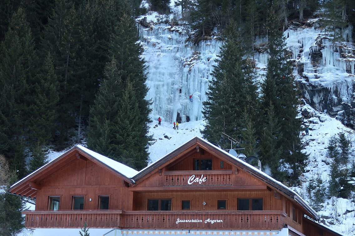 Der Angerer Eisfall oder auch Angerer Eisklettergarten genannt, befindet sich direkt hinter der Jausenstation Angerer und wird in der kalten Jahreszeit von Eiskletterern und Eiskletterkursen regelrecht gestürmt. Es gibt an dem ca. 20 bis 30 Meter hohen Eisschild viele Routen von WI 2 bis M7 und das alles direkt bei einer Jausenstation vor der man das Auto parkt. Aber Achtung, wer sich einen Platz unter den Eiszapfen zumindest am Tagesbeginn aussuchen will, muss zeitig aufstehen, zu Mittag steht man in der Stoßzeit oft wie in der Kletterhalle Schulter an Schulter.